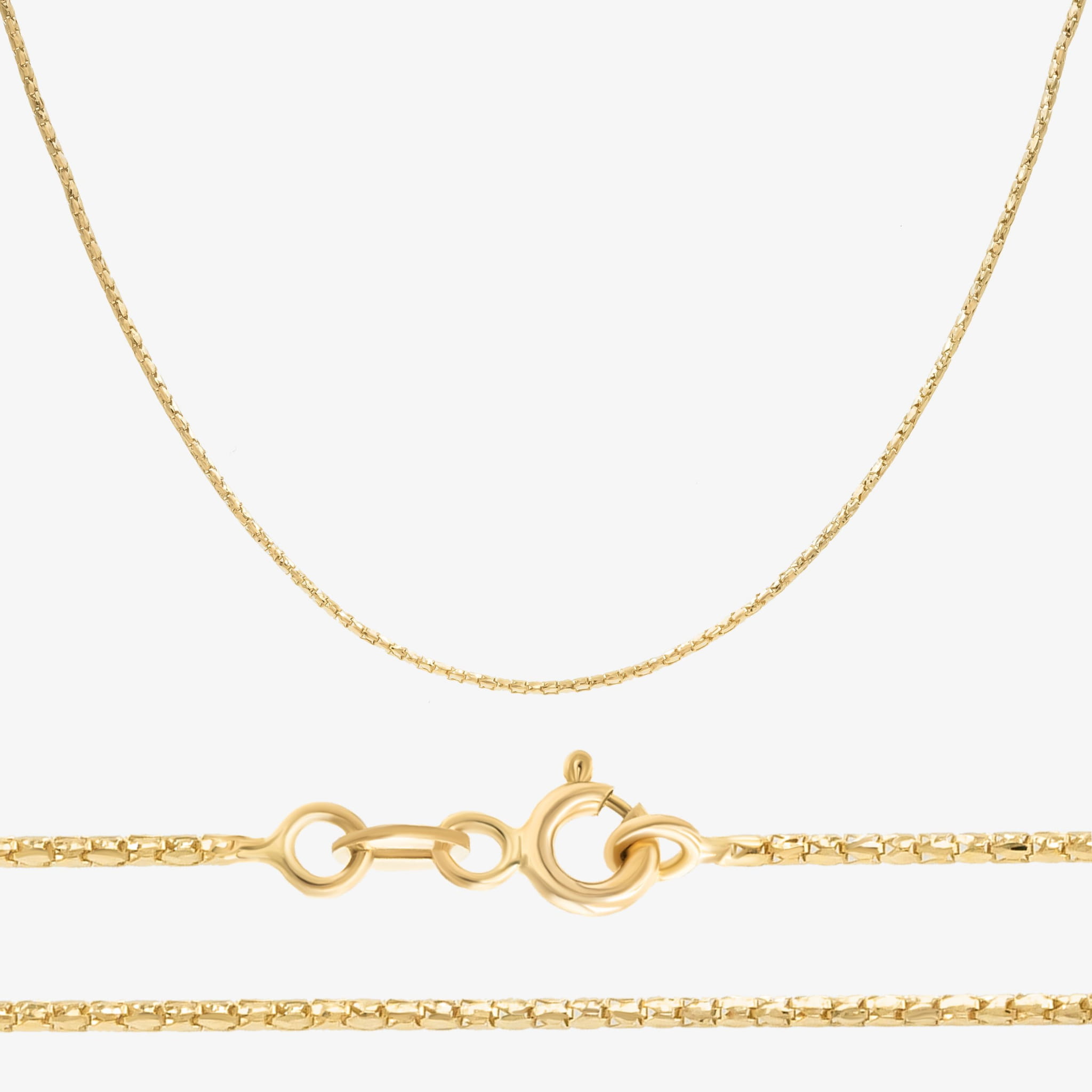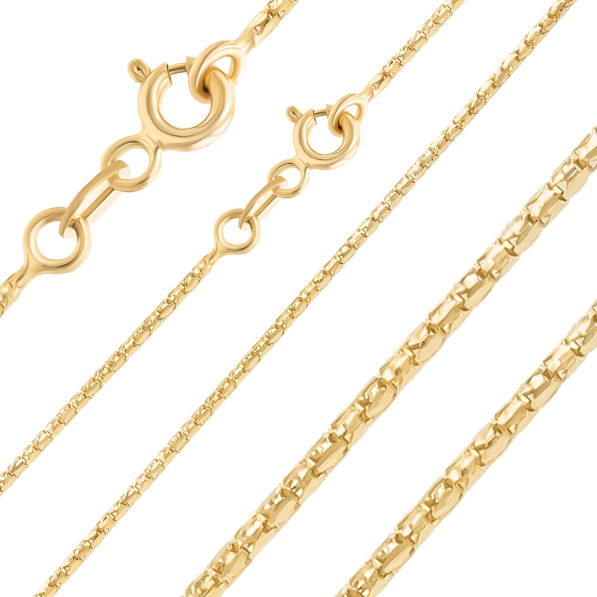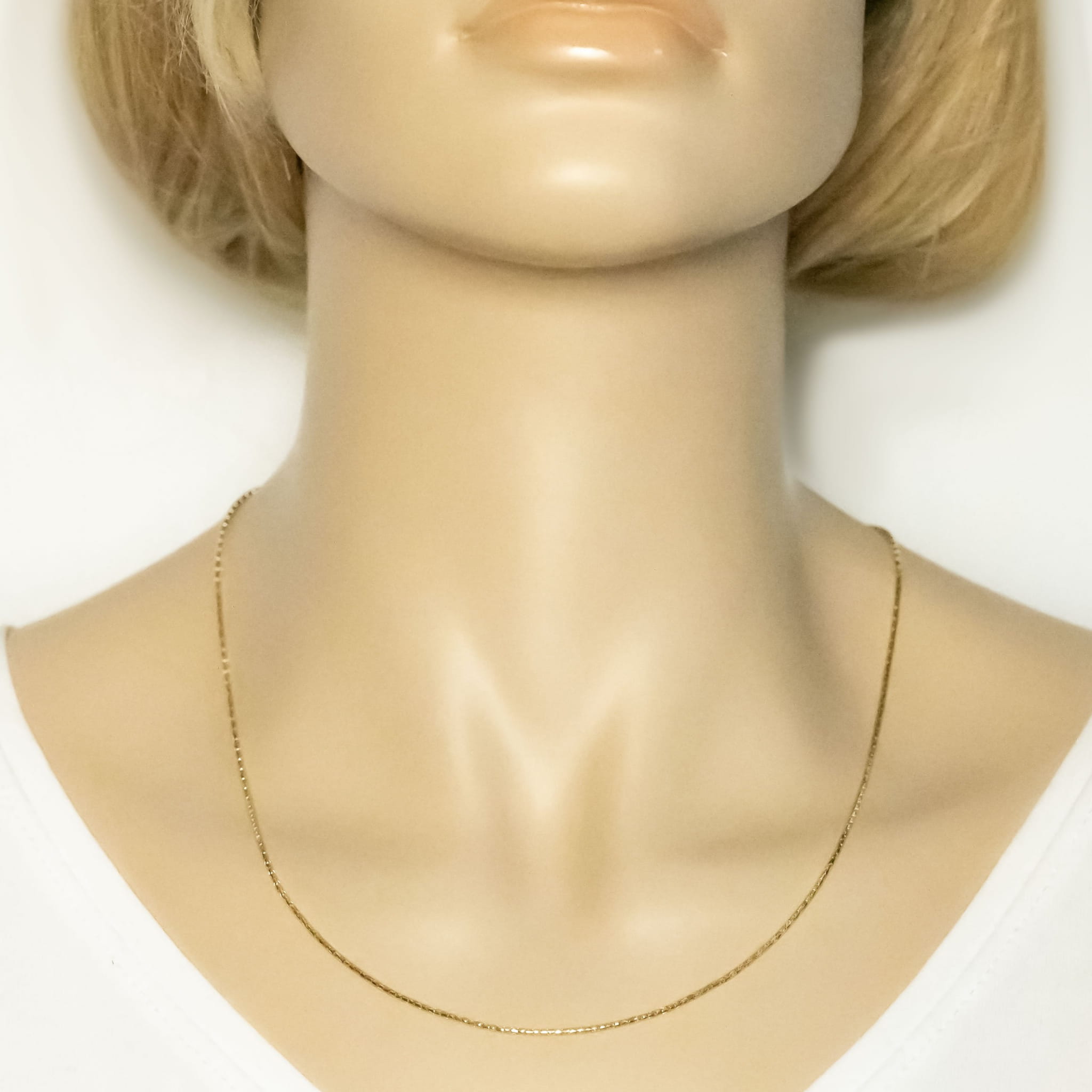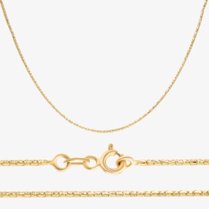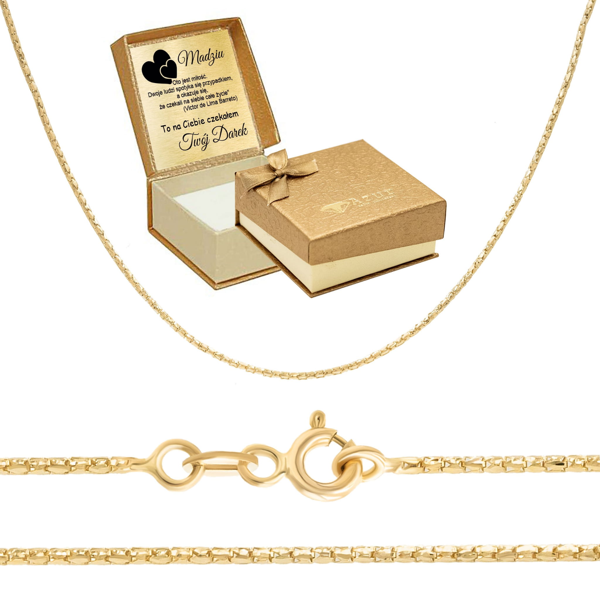 Złoty łańcuszek o eleganckim i subtelnym splocie. Biżuteria o długości 45cm została wykonana z żółtego złota o najwyższej jakości próbie 0.585. Nałożona wraz ze stylizacją doda Twojej osobie pełni blasku. Podarowana z okazji urodzin, Dnia Kobiet, Świąt oraz wręczona bez okazji z pewnością wywoła wiele radości.