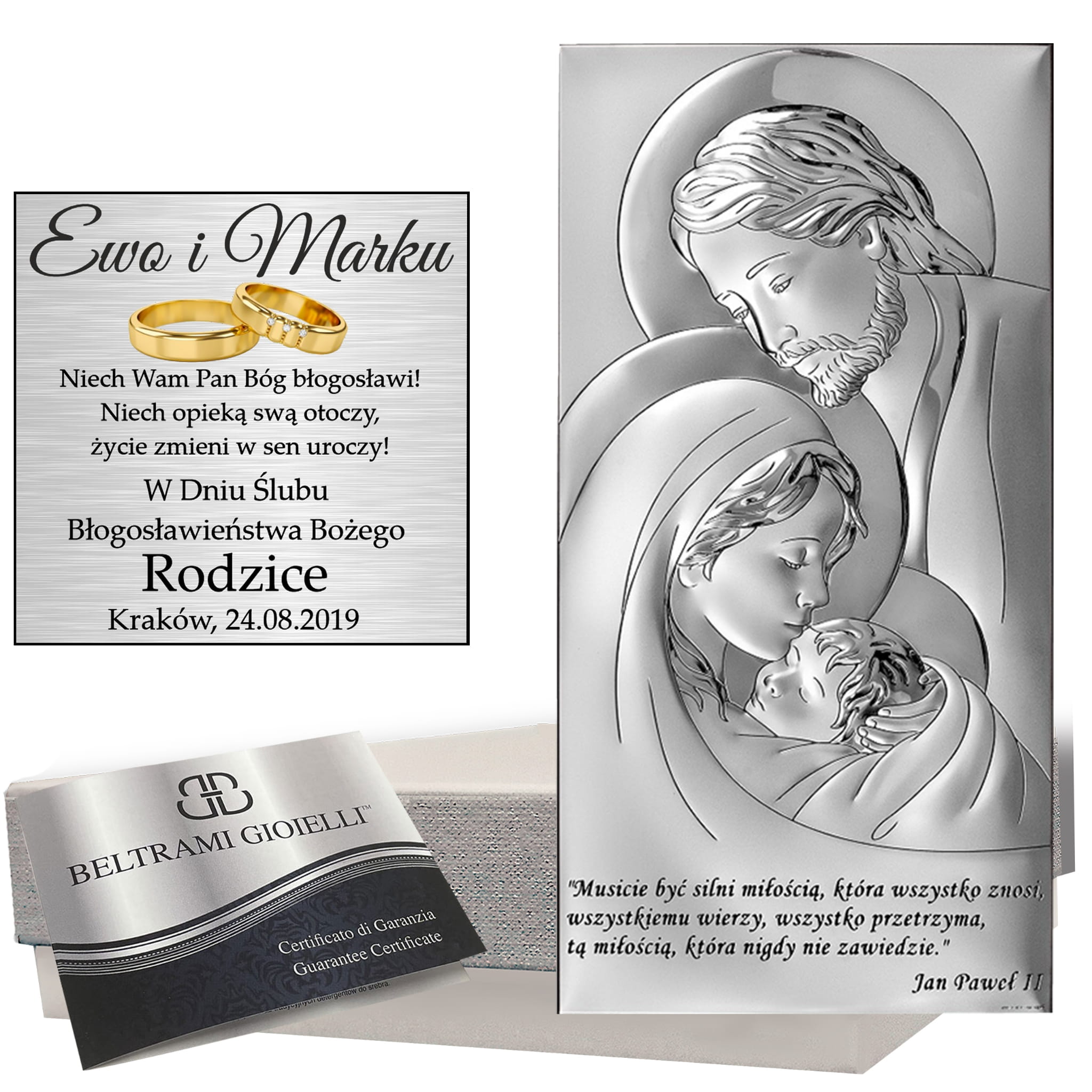 Srebrny obrazek przedstawiający Świętą Rodzinę to piękna i elegancka dekoracja, idealna jako pamiątka chrztu, komunii, bierzmowania czy ślubu. Wykonany z wysokiej jakości srebra, obrazek doskonale oddaje duchowość i znaczenie religijne, czyniąc go wyjątkowym prezentem na każdą okazję.