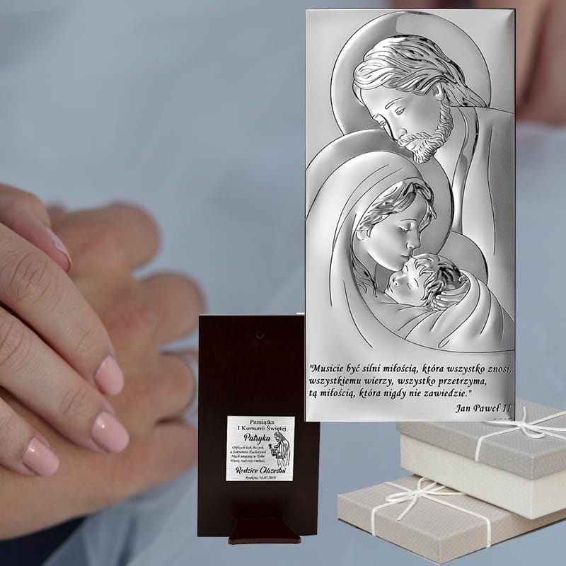 Srebrny obrazek Święta Rodzina w ramce – pamiątka na lata