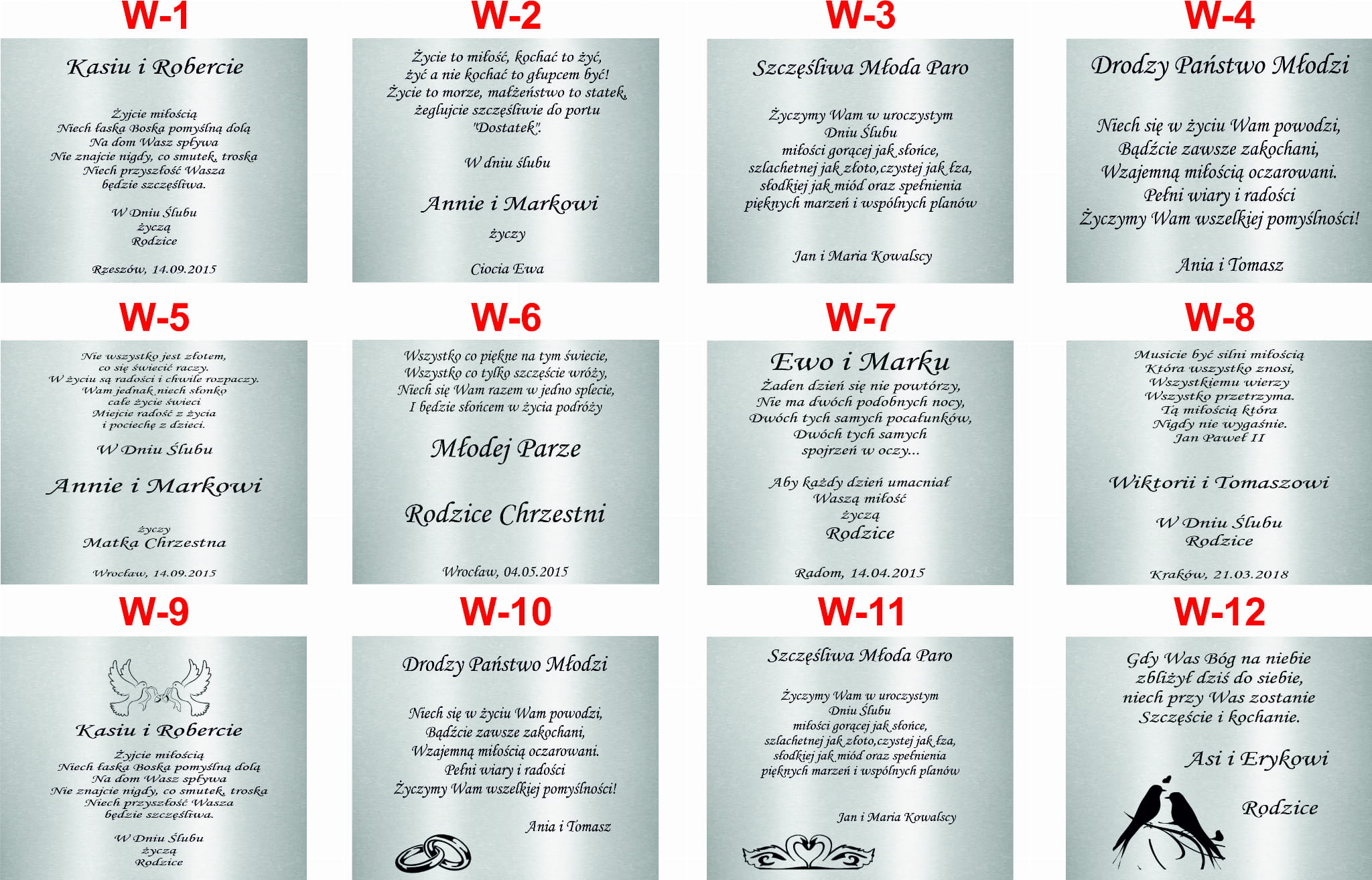 Wybierz właściwy model i wielkość oraz zastanów się jaki tekst graweru chcesz zamówić. Poniżej przedstawiamy kilka wzorów na różne okazje. Jeżeli któryś Ci odpowiada to zanotuj nr wzoru.