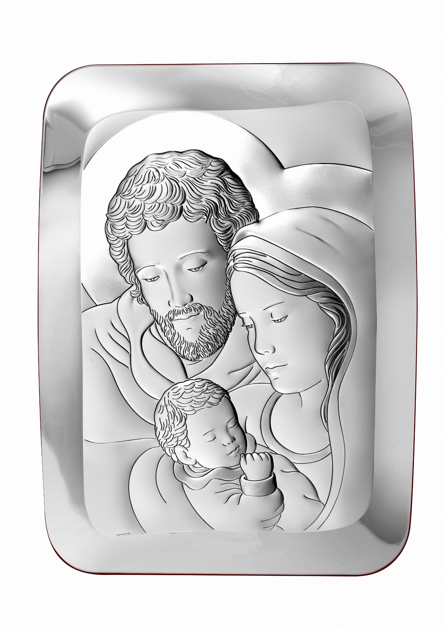 Szykowny srebrny obrazek Święta Rodzina - Matka Boska z Józefem i Dzieciątkiem. Symbol ten przypomina, jak ważna jest rodzina, zwłaszcza ta najbliższa i pielęgnowanie więzi pomiędzy poszczególnymi jej członkami. Pomaga w trudnych okresach i odgrywa dużą rolę w rodzinnych relacjach.