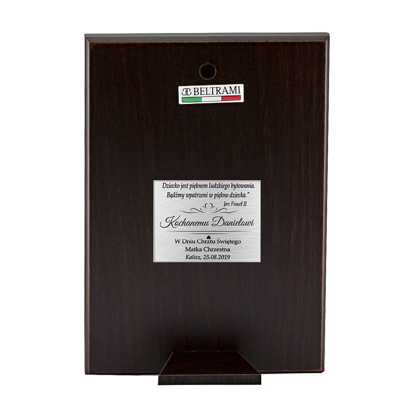 W wyniku połączenia materiałów najwyższej jakości: drewna i srebra oraz włoskiej dokładności i dbałości o detale otrzymujemy wysokiej jakości produkt. Do jego produkcji użyto innowacyjnego metalu MIRO-SILVER. Jego wierzchnia warstwa to czyste srebro próby 999.95 która dzięki specjalnej technologii przy wykorzystaniu procesów atomowych jest znacznie twardsza i odporniejsza na śniedzenie i zarysowania w porównaniu z tradycyjnymi metodami srebrzenia. Dodatkowo obrazek zabezpieczono specjalnym lakierem, gwarantującym, że obrazek doskonale odbija światło zachowując piękny wygląd przez wiele lat. Całość jest umocowana na drewnianym podeście. Jakość finalnego produktu potwierdza dołączony CERTYFIKAT JAKOŚCI.