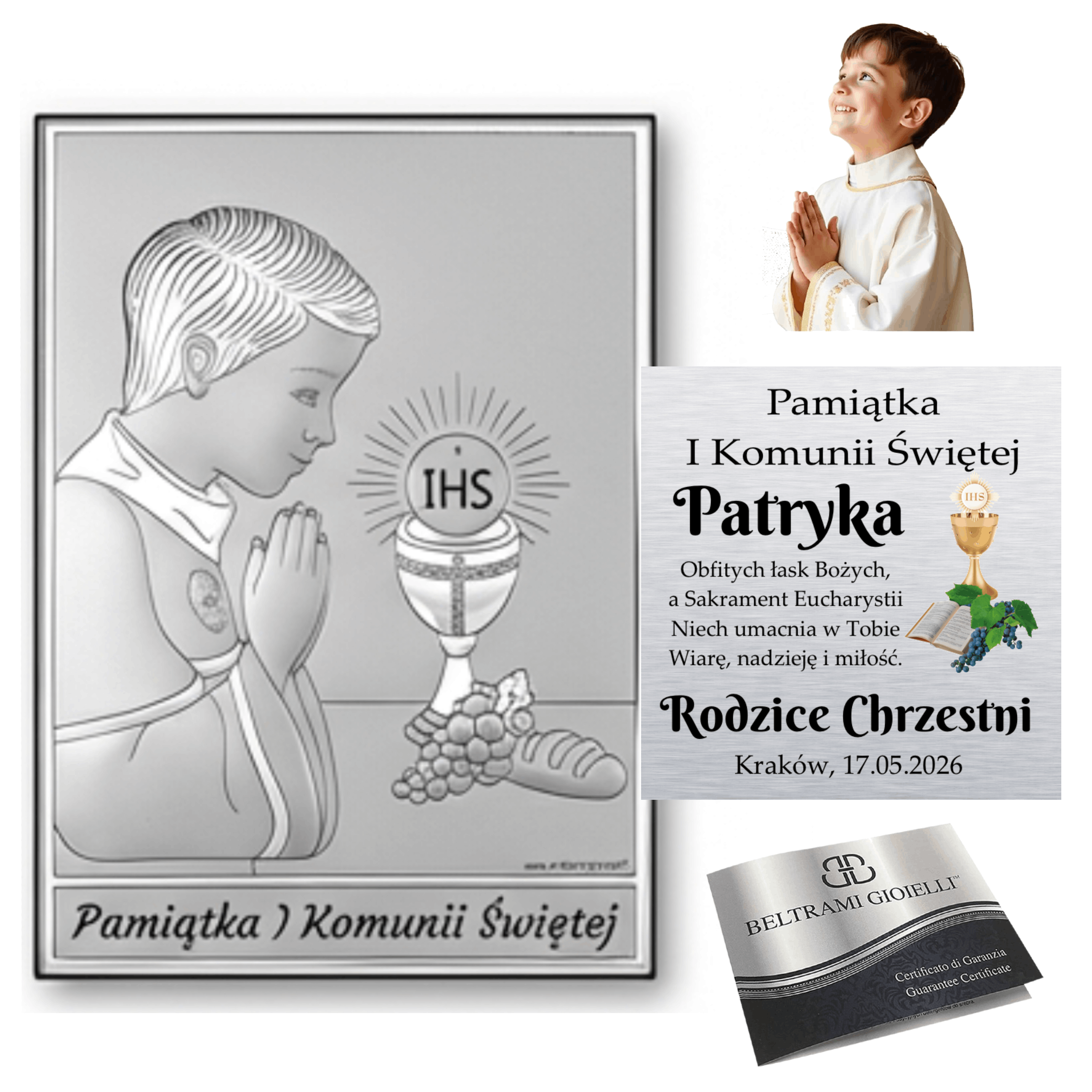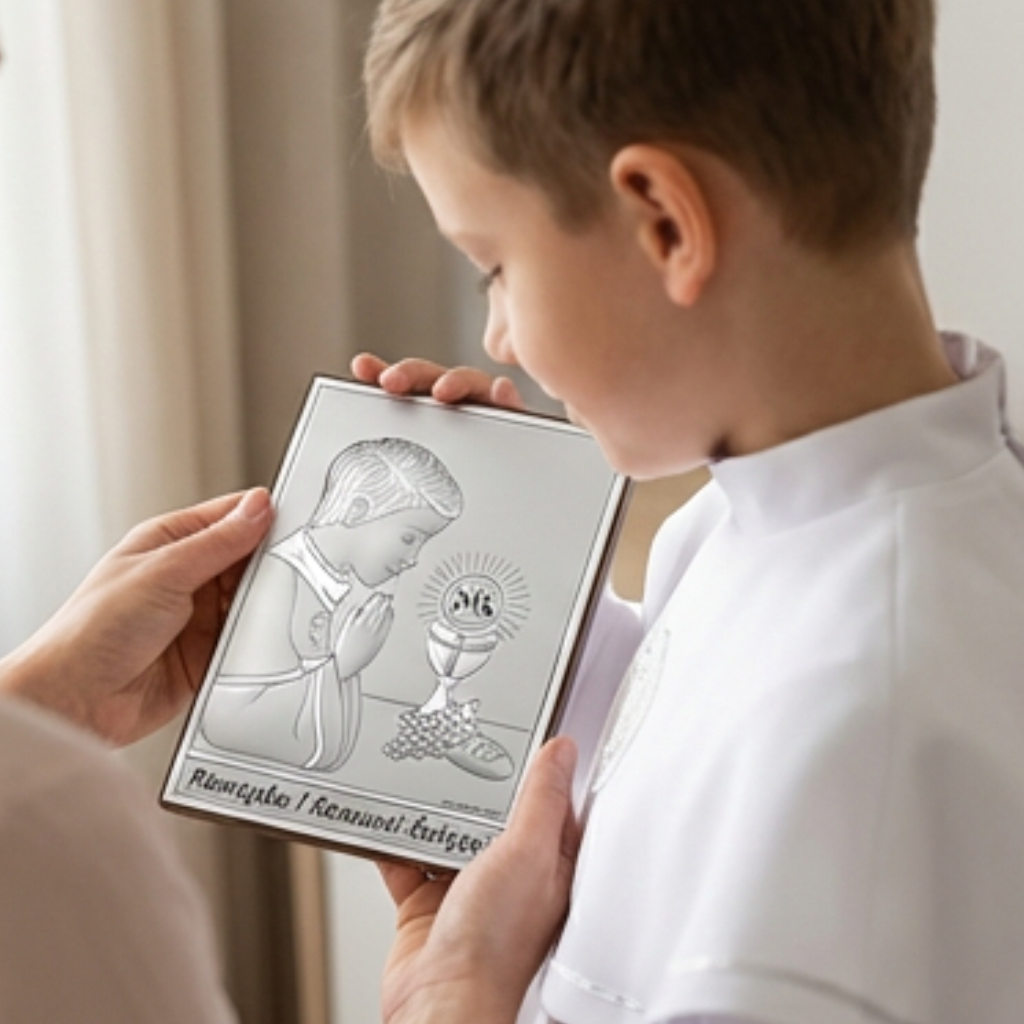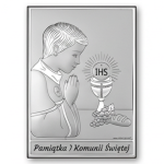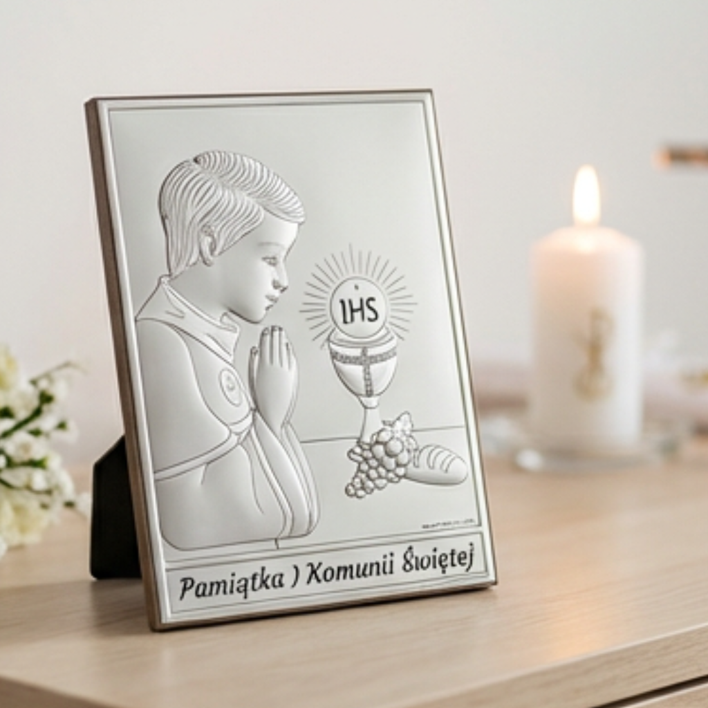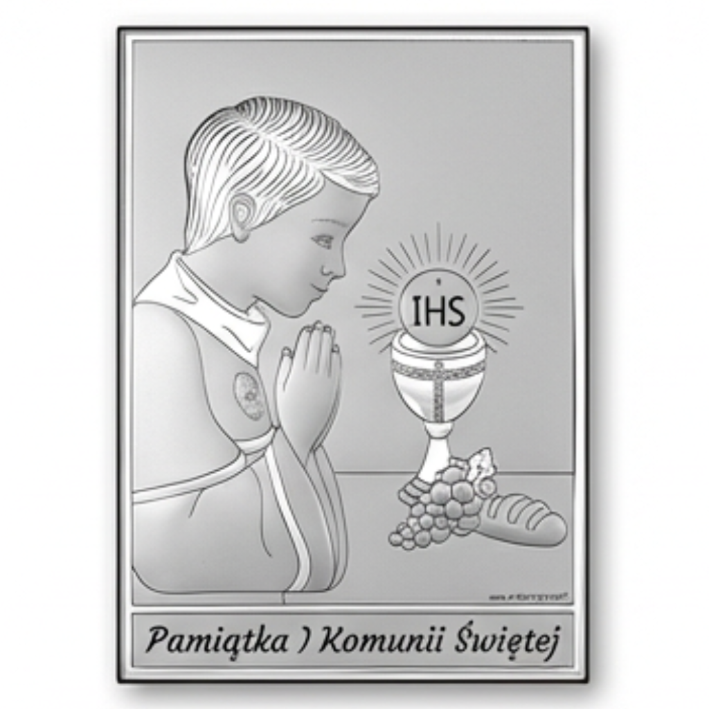 Srebrny obrazek na komunię – klasyczna pamiątka I Komunii Świętej dla chłopca
