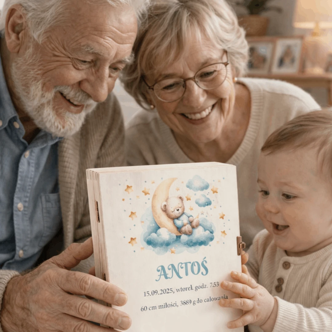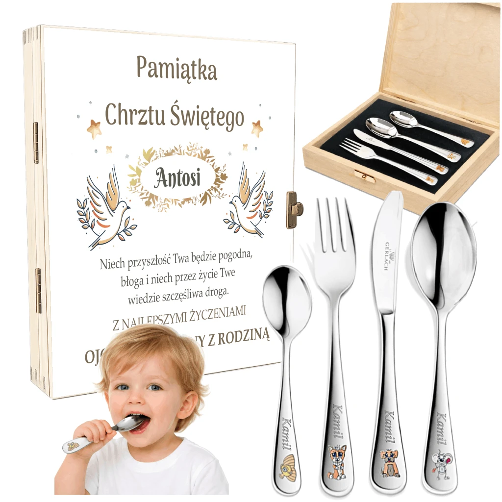 Sztućce dla dzieci Gerlach zestaw w drewnianym etui z nadrukiem dla chłopca na chrzciny