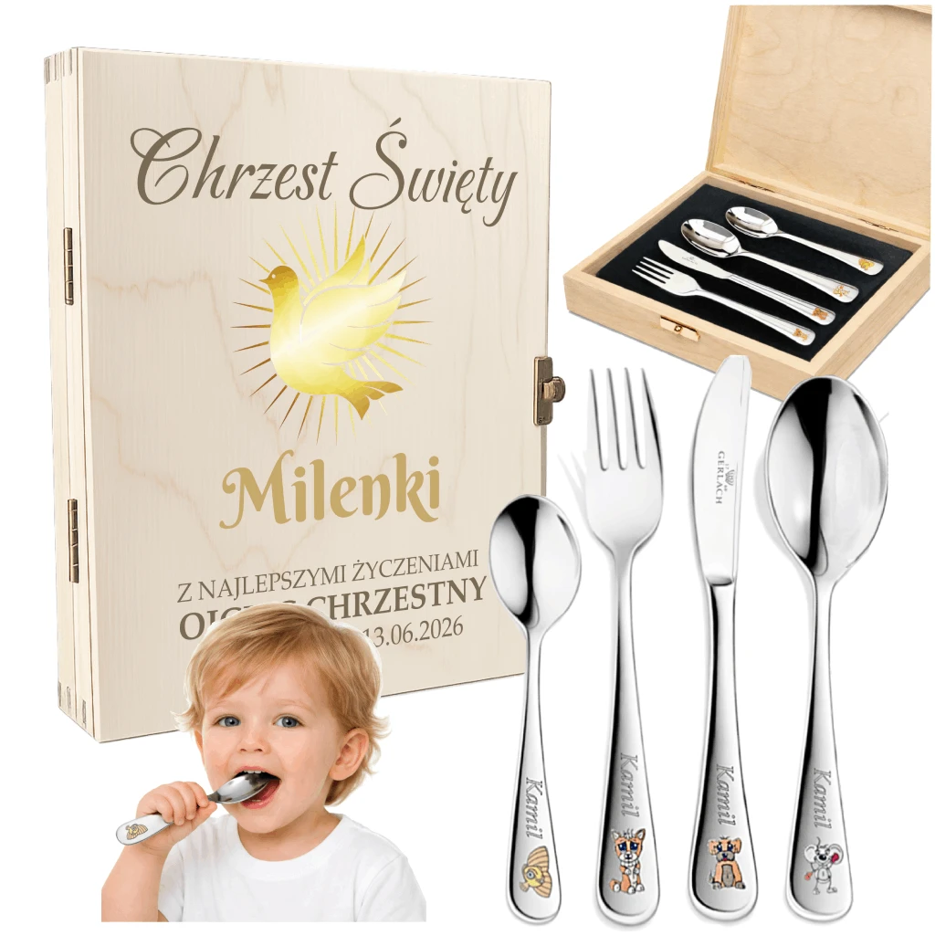 Sztućce dla dzieci Gerlach zestaw w drewnianym etui z nadrukiem dla dziewczynki na chrzest