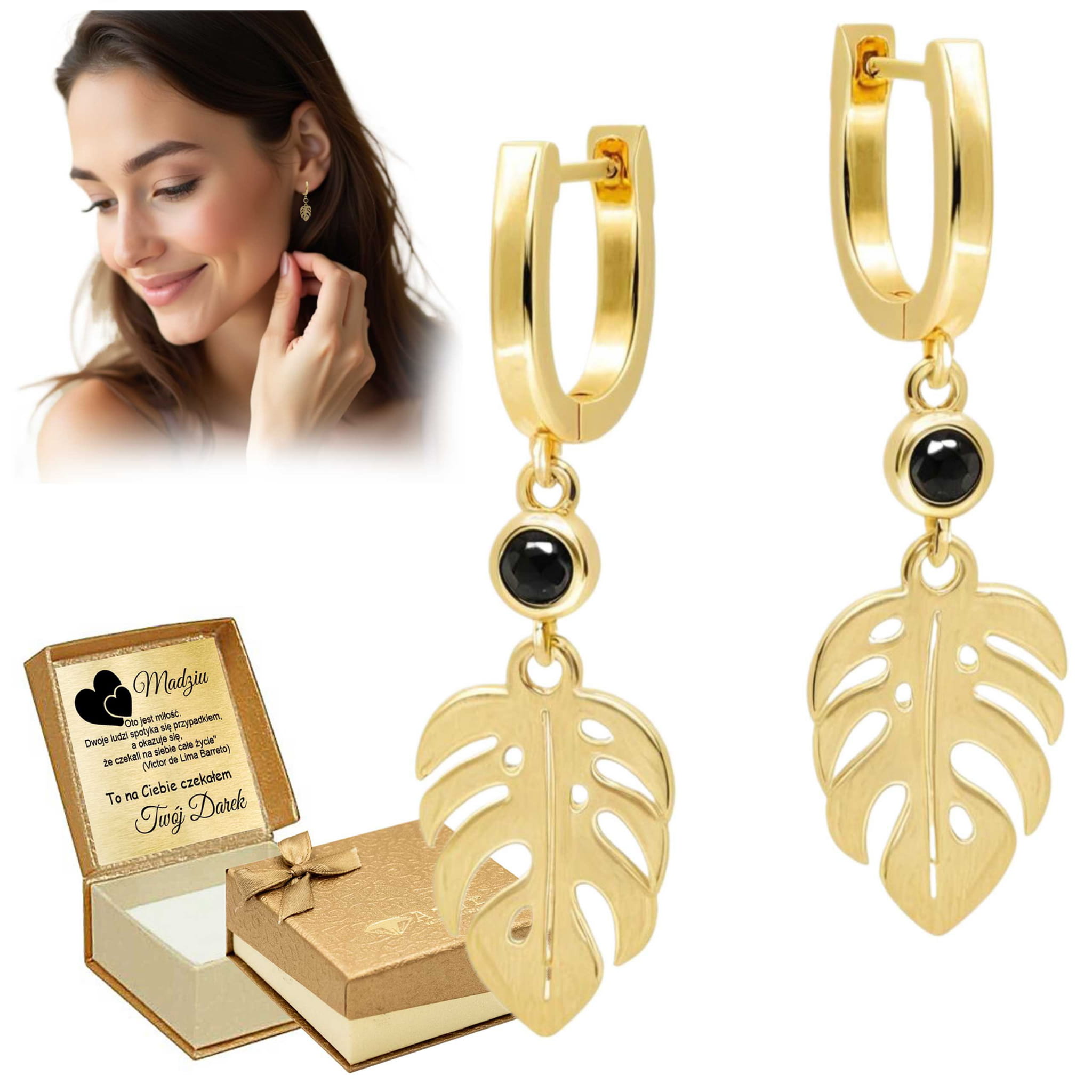 Eleganckie pozłacane srebrne kolczyki z listkami i czarną cyrkonią – prezent z grawerem