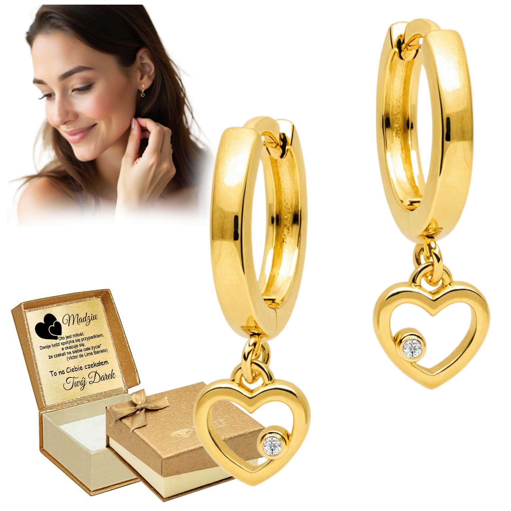 Złote kolczyki z motywem koniczynki i serca – elegancja i szczęście z możliwością personalizacji i ozdobnym pudełkiem