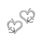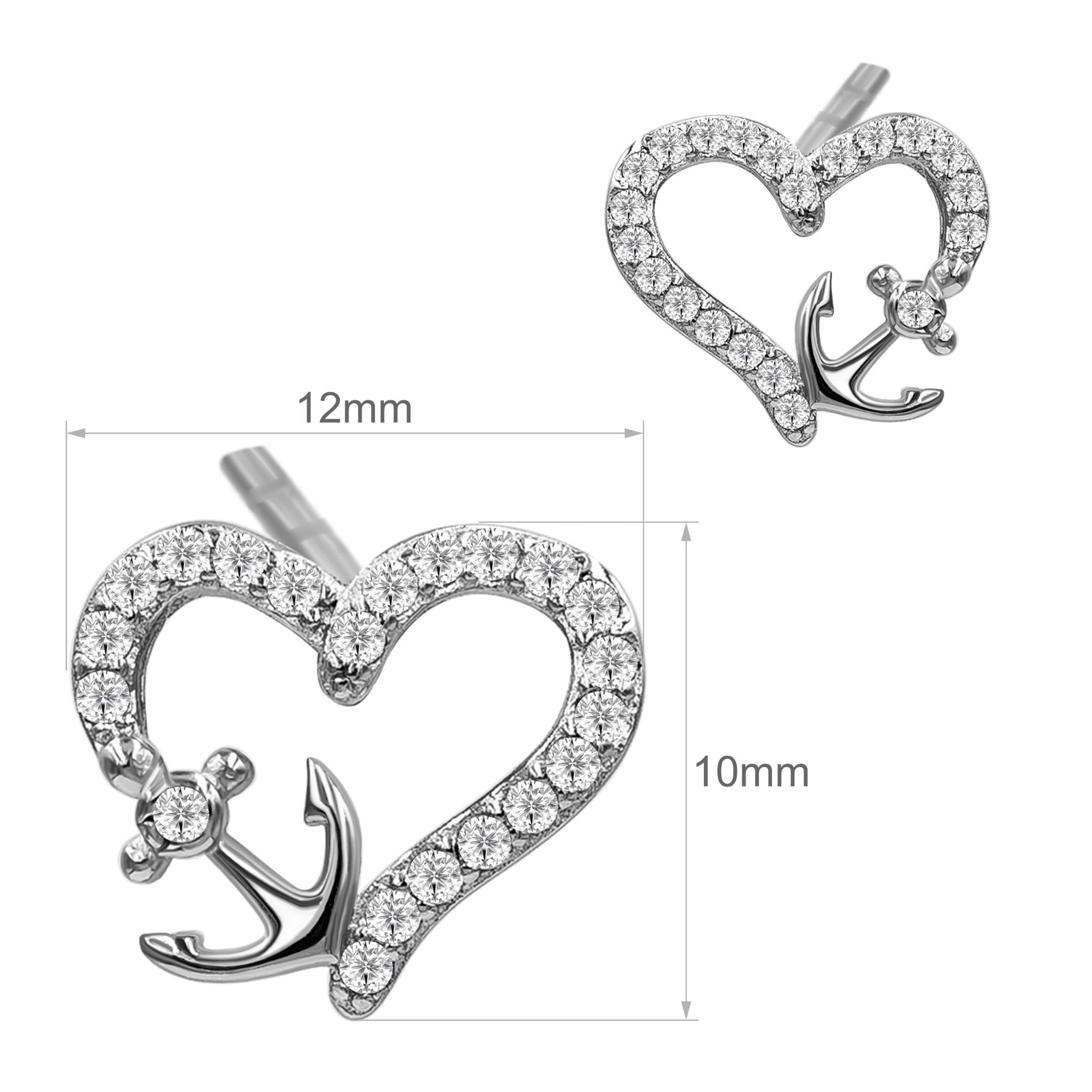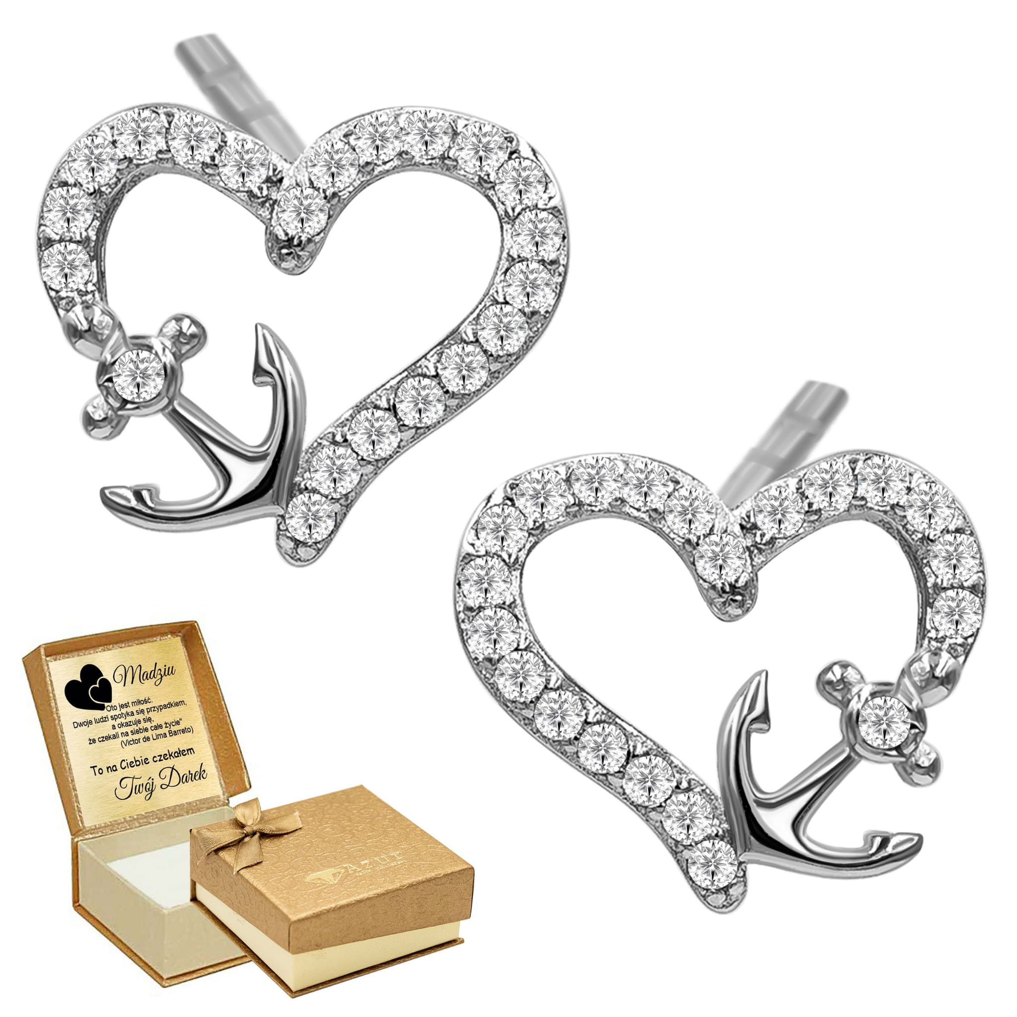 Srebrne Kolczyki Sztyft Serduszka z Oryginalnym Wzorem Kotwicą i Osadzonymi Białymi Cyrkoniami