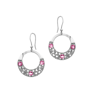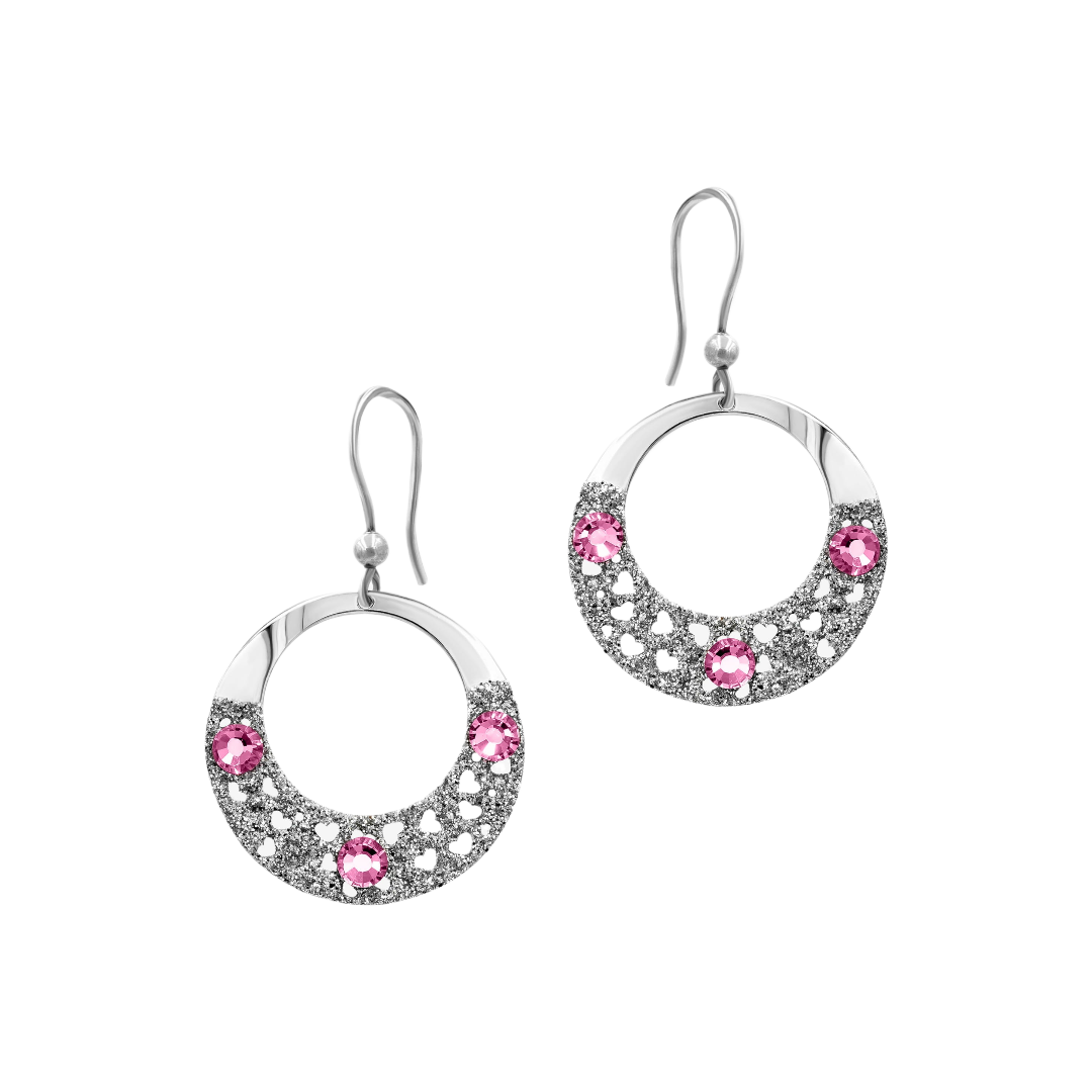 Srebrne Kolczyki Wiszące Okrągłe z Wyciętymi Serduszkami Brokatem i Różowymi Cyrkoniami