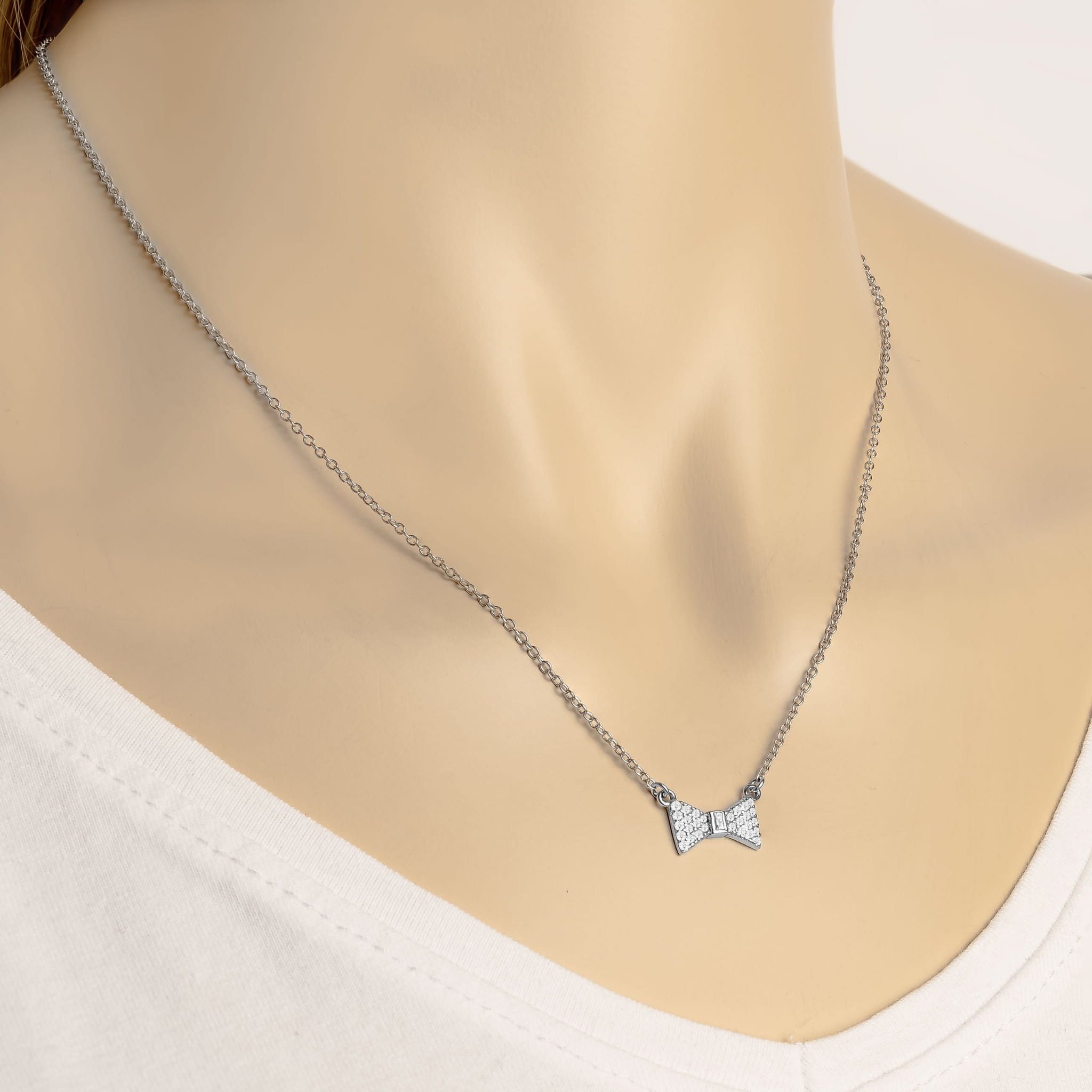 Elegancki i błyskotliwy srebrny naszyjnik z zawieszką kokardki z osadzonymi białymi cyrkoniami