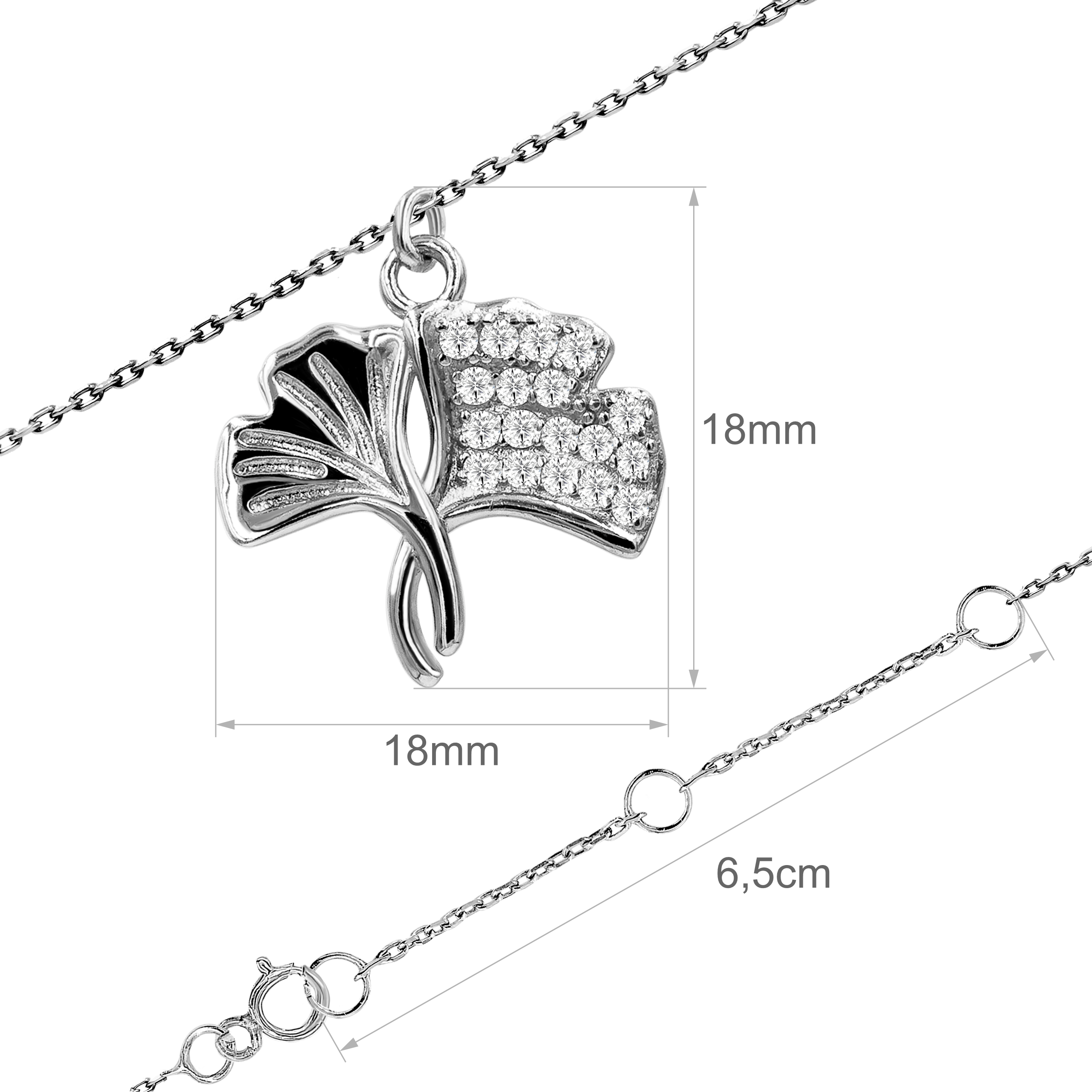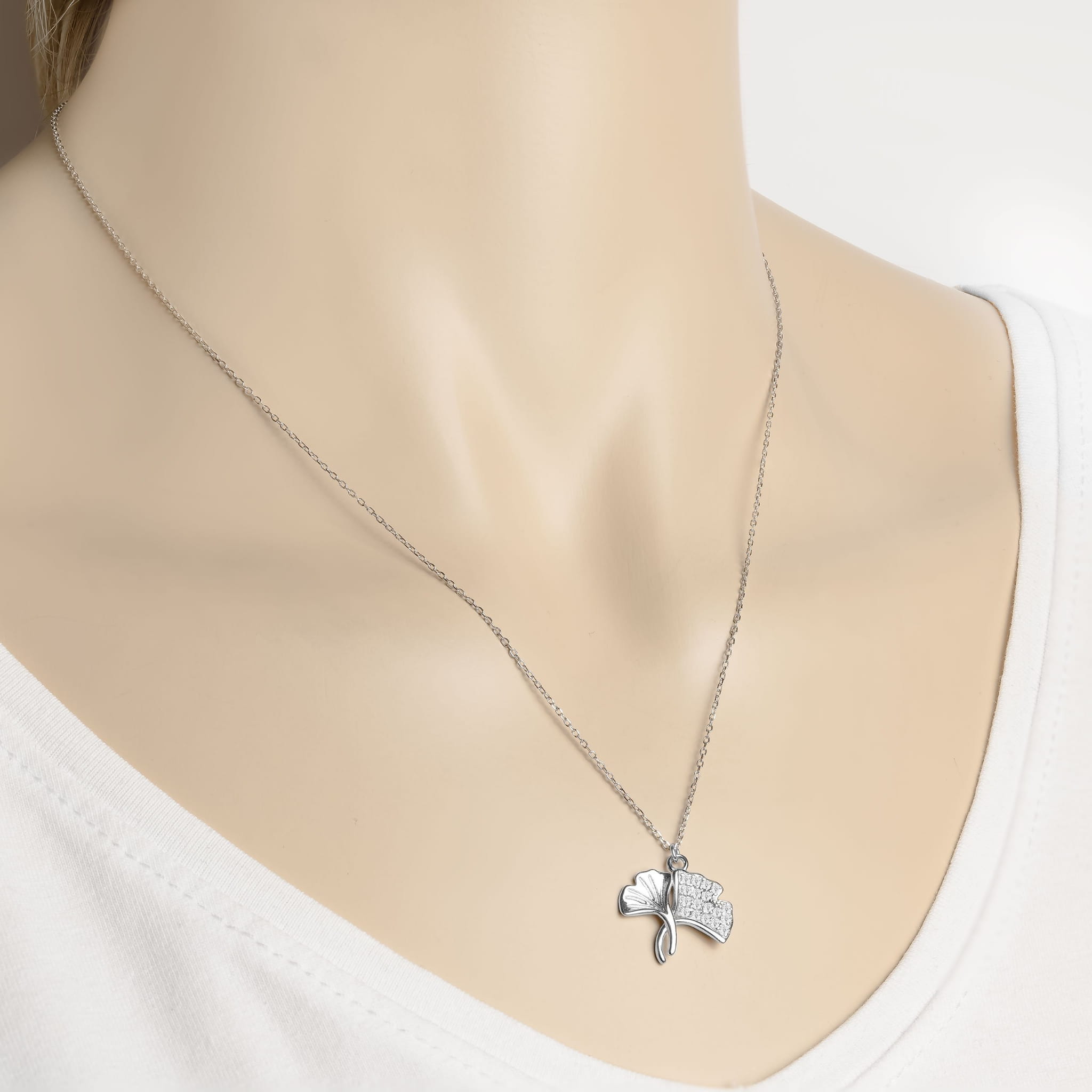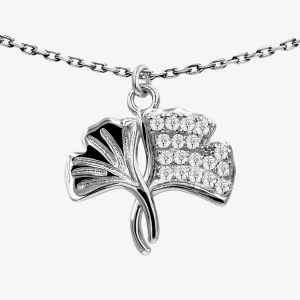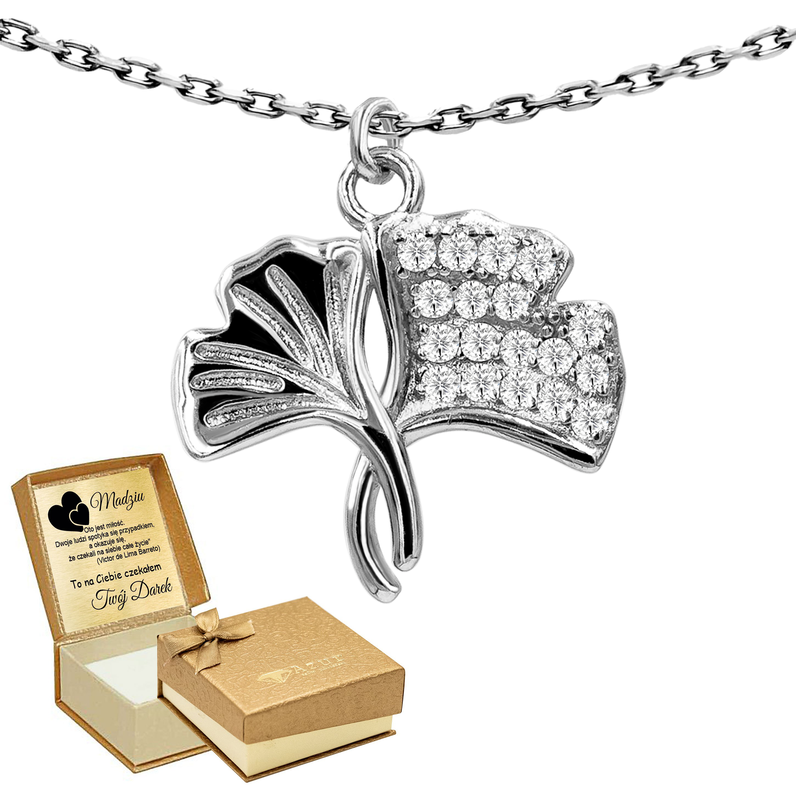 Srebrny naszyjnik z motywem botanicznym liścia miłorzębu i cyrkoniami.
