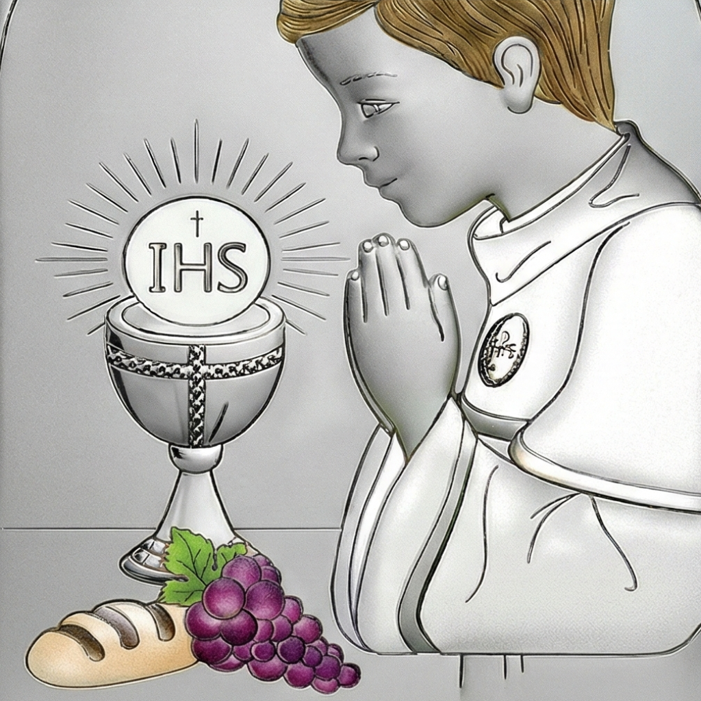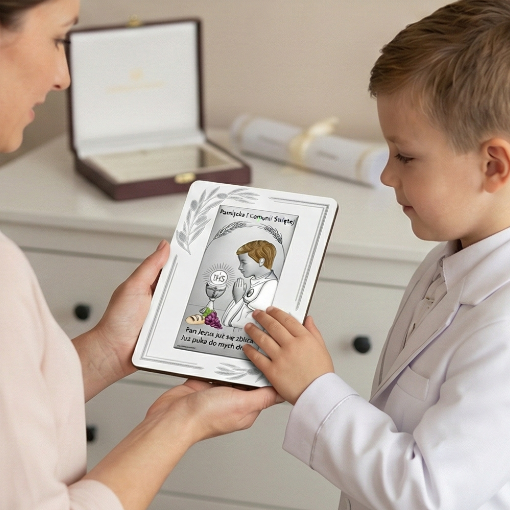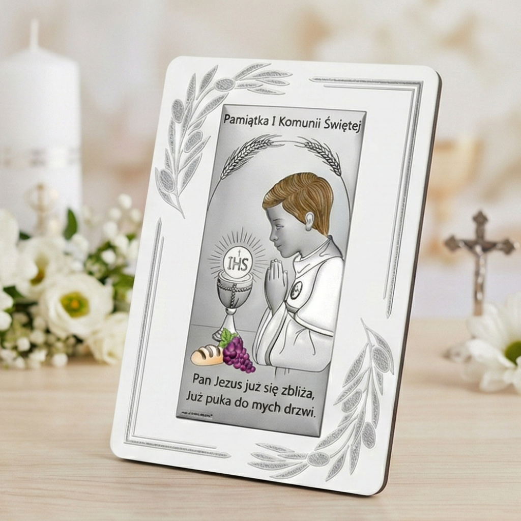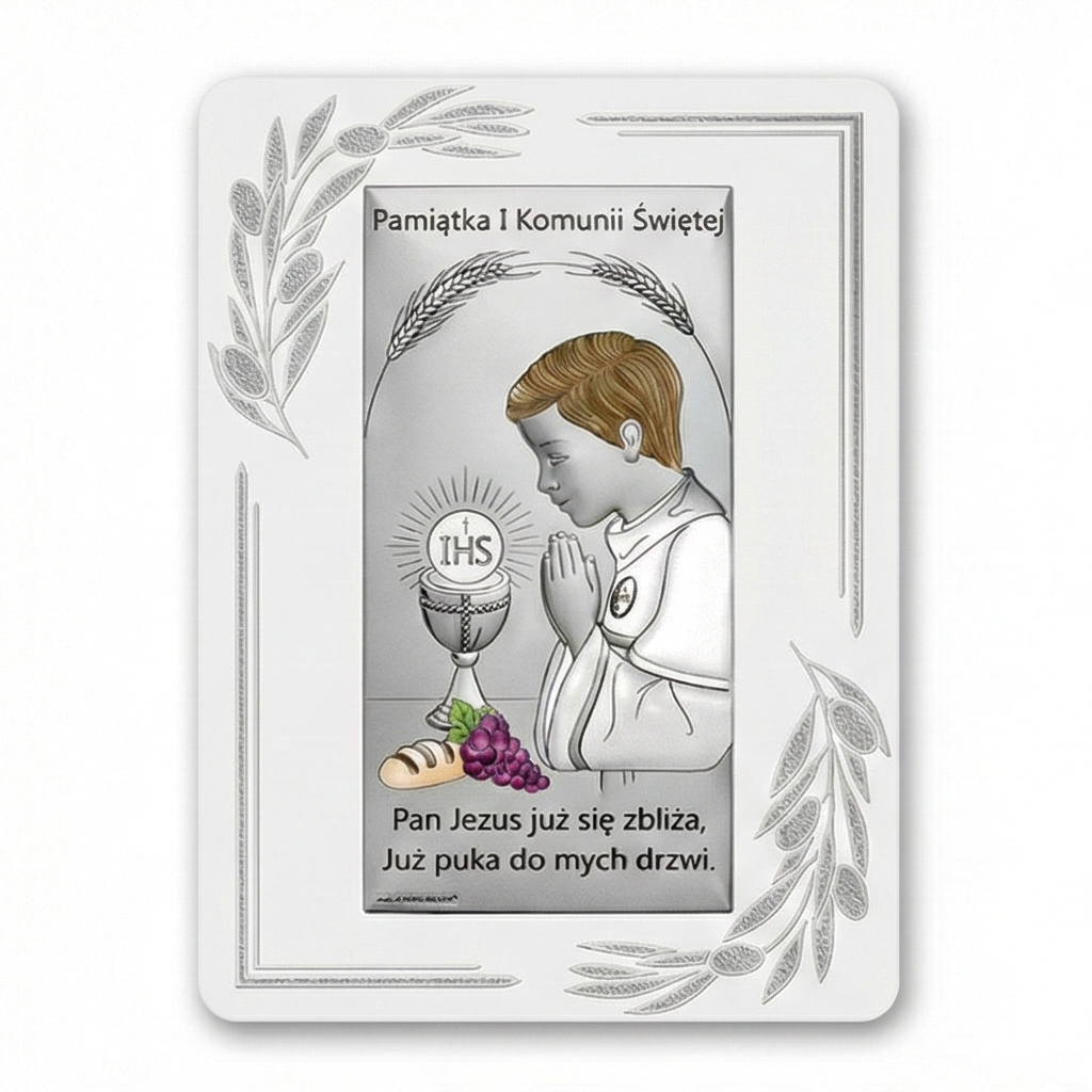 Srebrny obrazek komunijny – pamiątka I Komunii Świętej dla chłopca