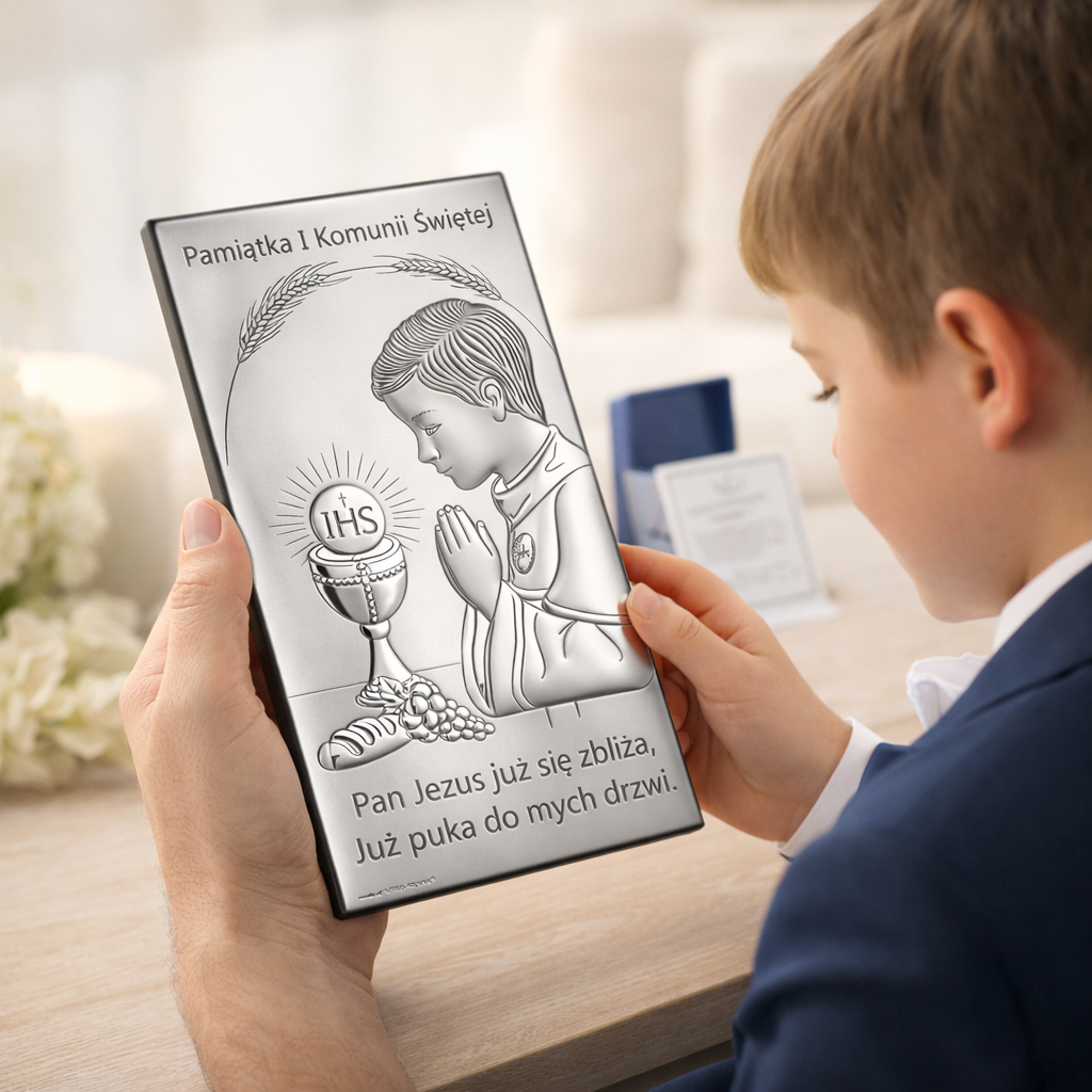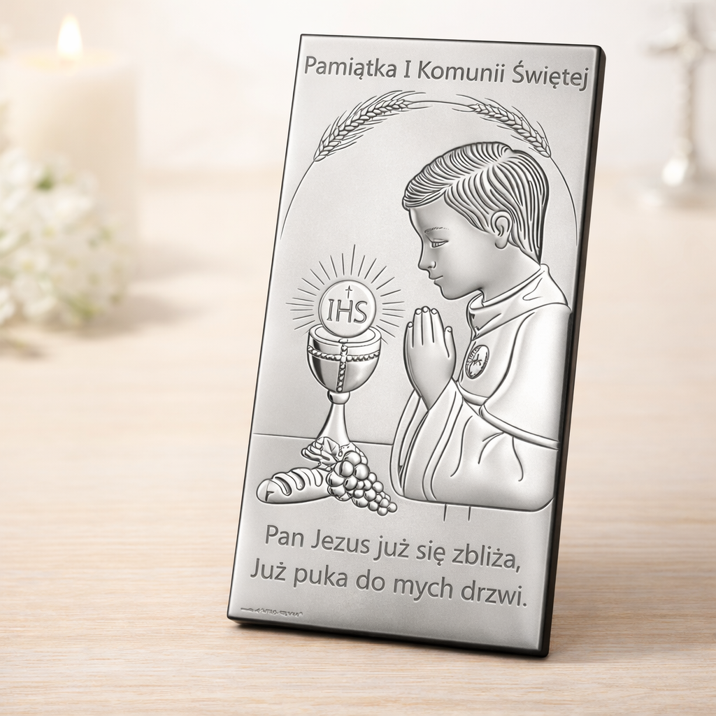 Jeśli szukasz pamiątki, która jest jednocześnie elegancka i głęboko symboliczna, ten srebrny obrazek na komunię dla chłopca będzie trafionym wyborem. Subtelnie przypomina o wyjątkowym dniu i duchowej drodze dziecka – dziś i za wiele lat.