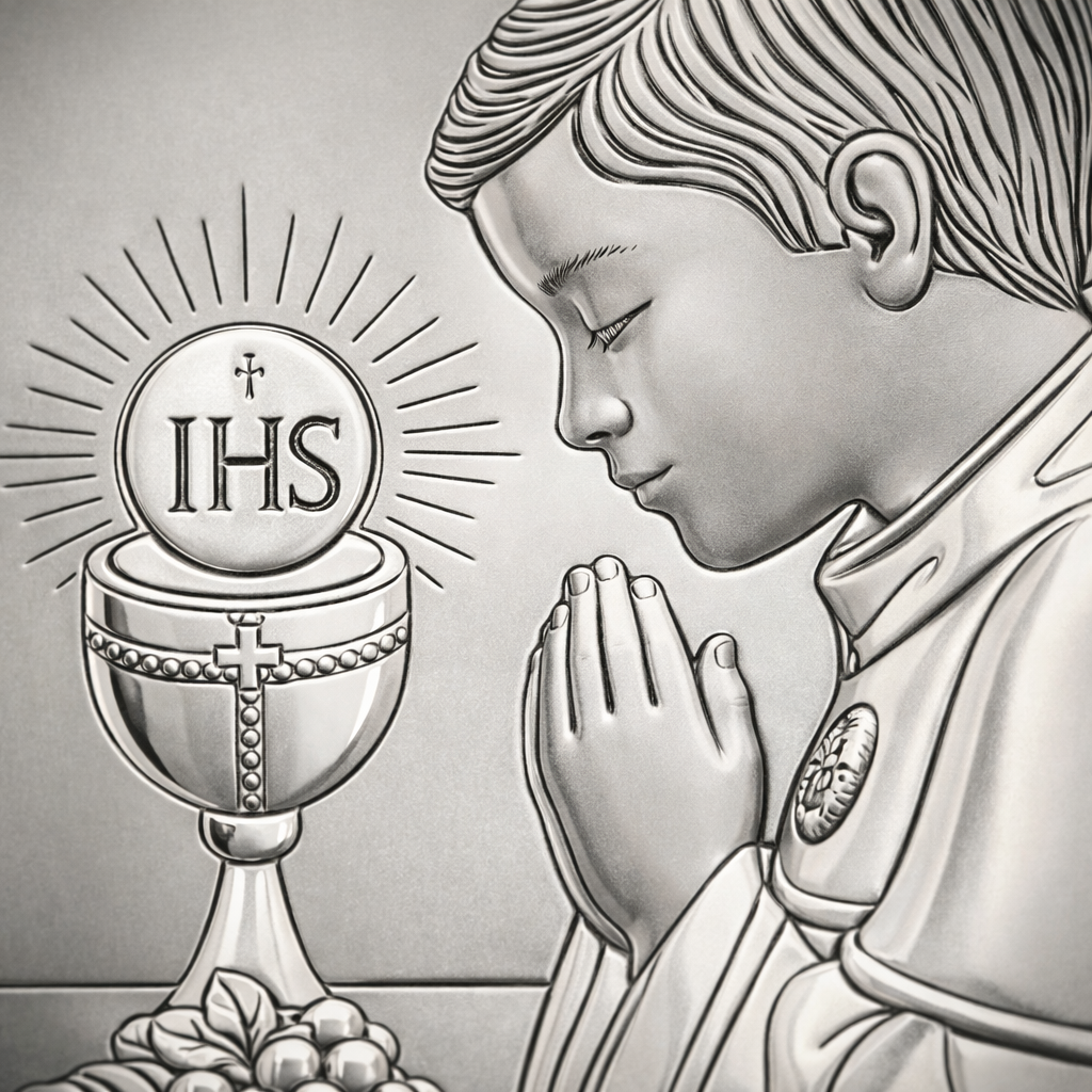 Ten srebrny obrazek komunijny z motywem modlącego się chłopca oraz kielicha z symbolem IHS to wyjątkowa pamiątka sacrum – spokojna, elegancka i ponadczasowa. Idealnie sprawdzi się jako prezent na I Komunię Świętą od chrzestnych, dziadków lub rodziców. To piękny znak wiary i rodzinnej pamięci, który zostaje na lata.