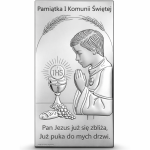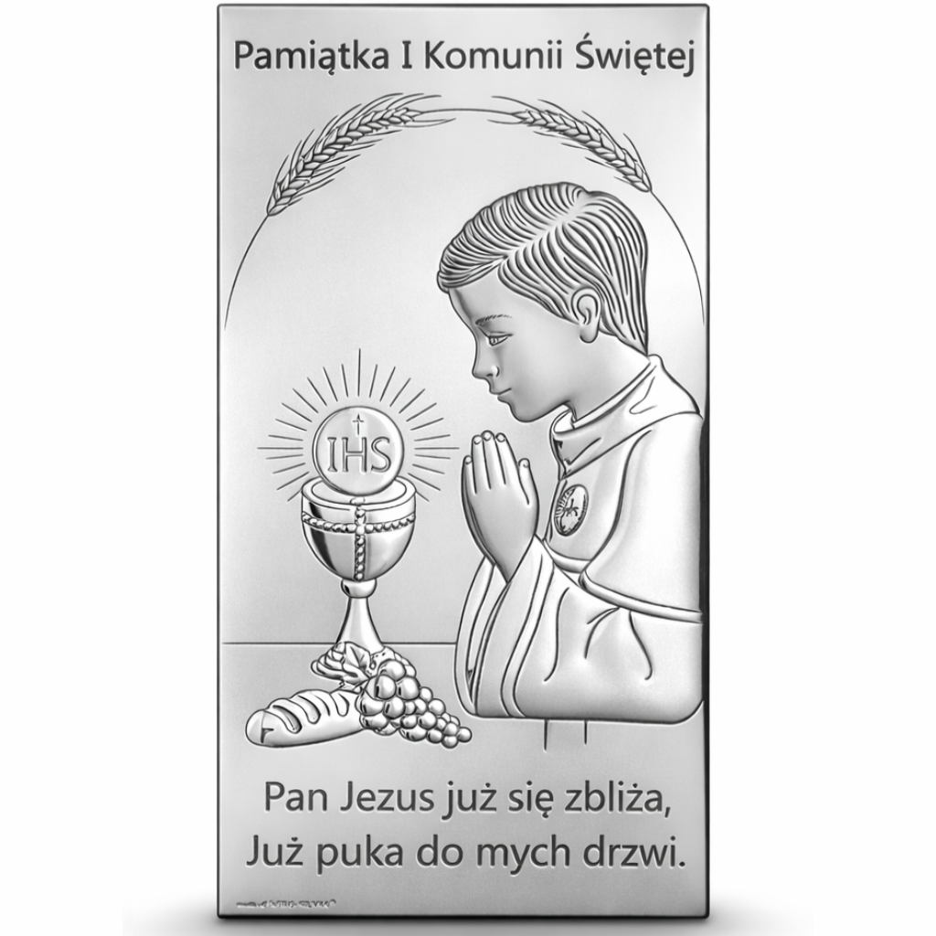Srebrny obrazek komunijny – pamiątka I Komunii dla chłopca z symbolem Eucharystii