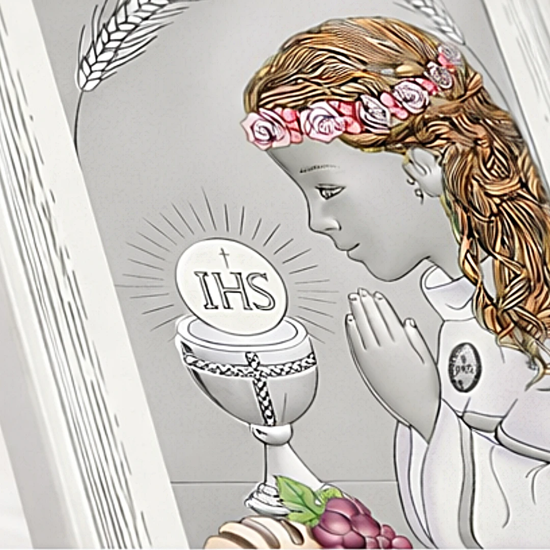 Srebrny obrazek komunijny dla dziewczynki – piękna pamiątka pełna symboliki