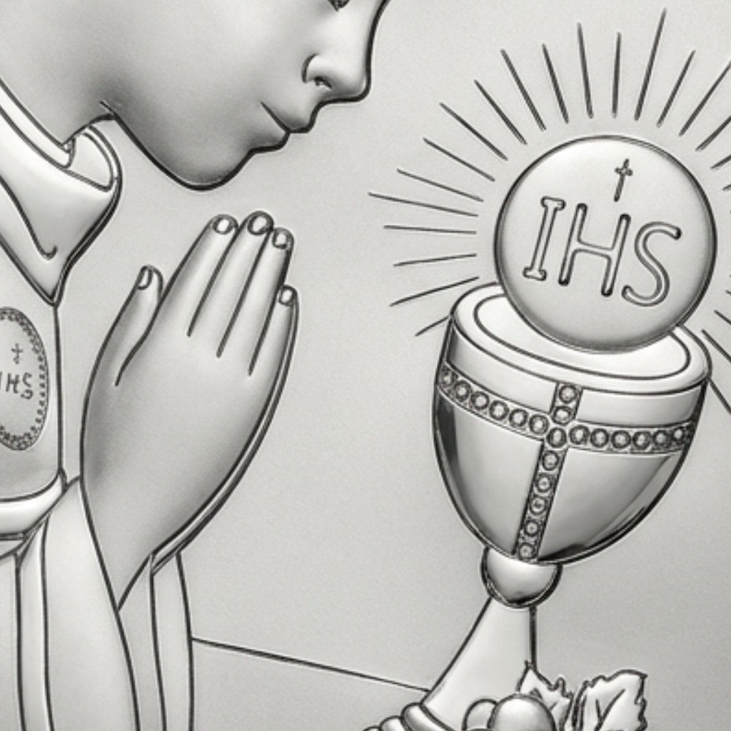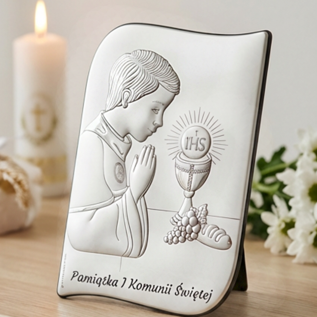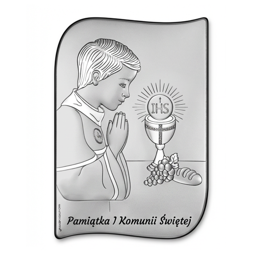 Srebrny obrazek komunijny falowany – elegancka pamiątka I Komunii Świętej dla chłopca