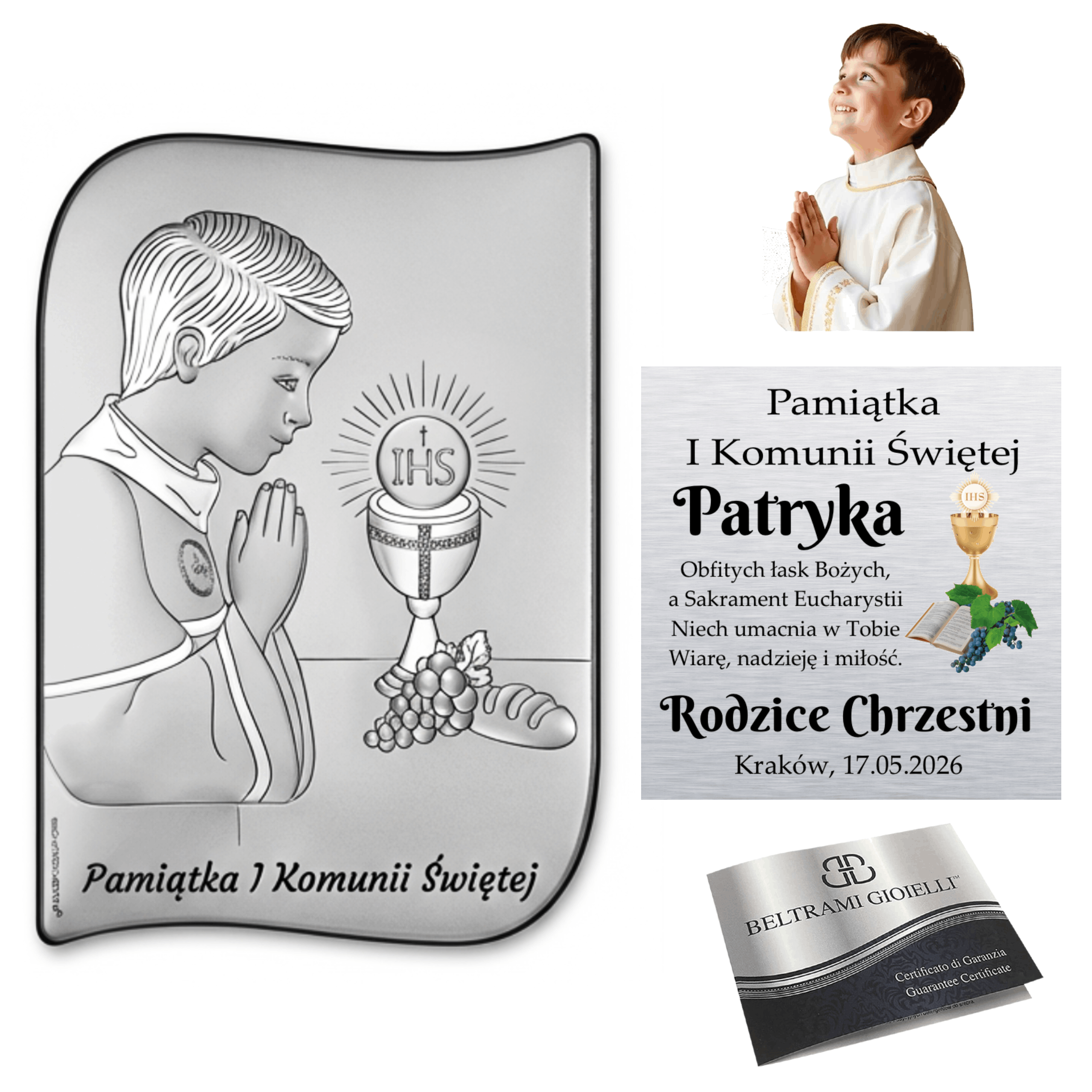 - Motyw: modlący się chłopiec, kielich komunijny, symbol IHS, winogrona i chleb + napis „Pamiątka I Komunii Świętej”.