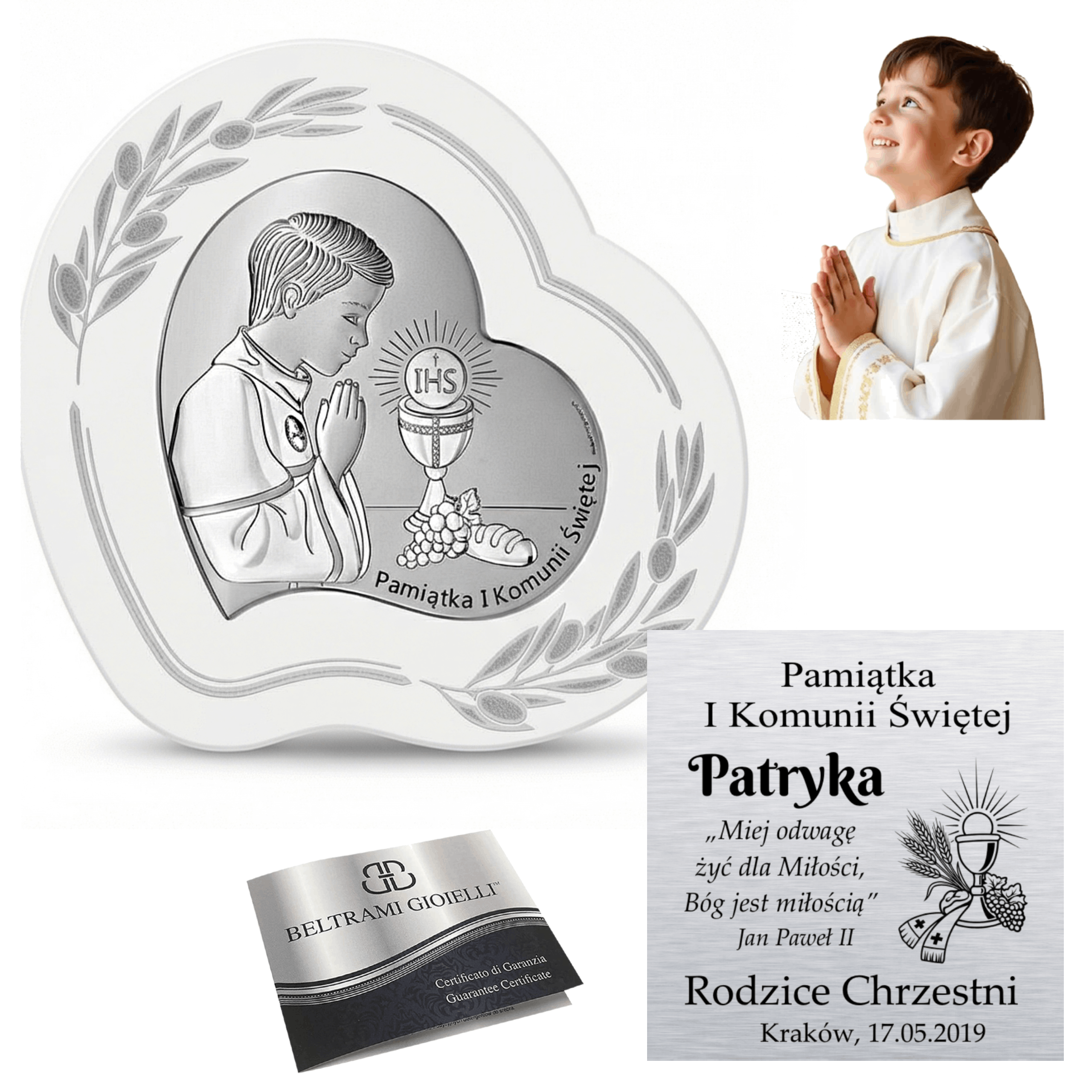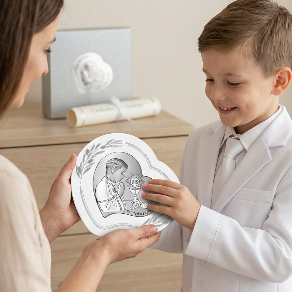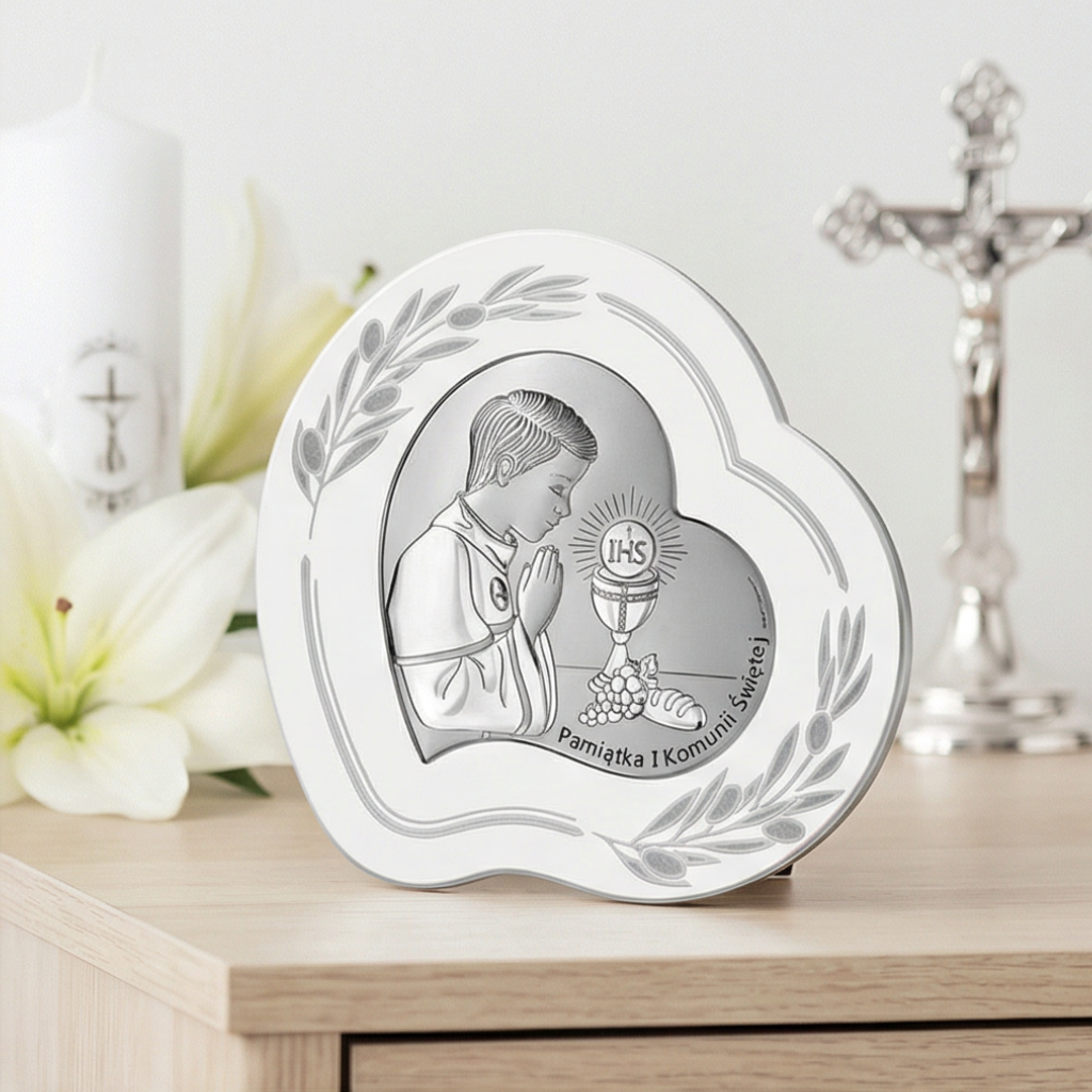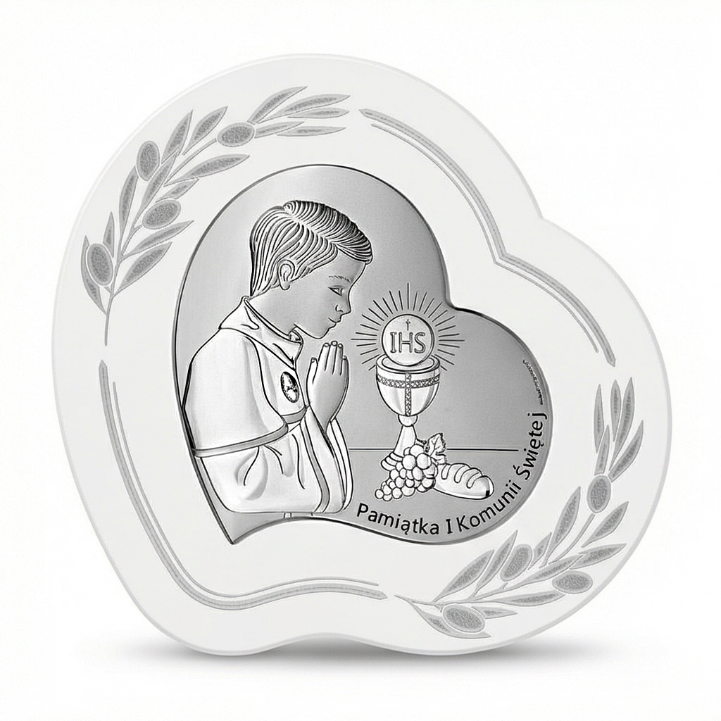Srebrny obrazek komunijny w kształcie serca – elegancka pamiątka I Komunii Świętej dla chłopca