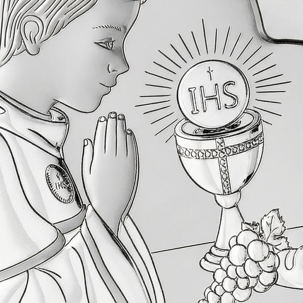 - Grawer / dedykacja: Jeśli chcesz dodać osobisty akcent, wybierz tabliczkę z dedykacją montowaną z tyłu obrazka. To prosty detal, który sprawia, że pamiątka I Komunii Świętej staje się naprawdę wyjątkowa i „na zawsze”.
