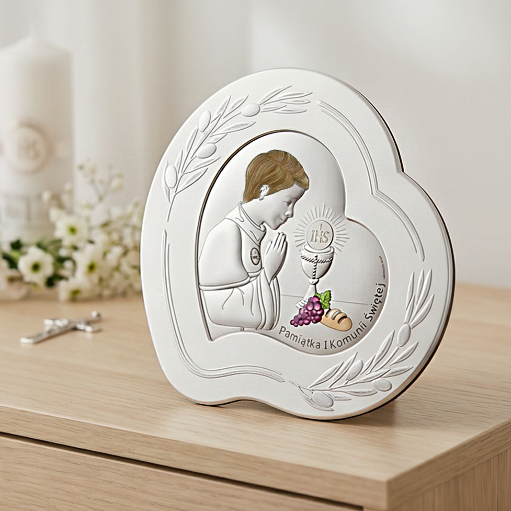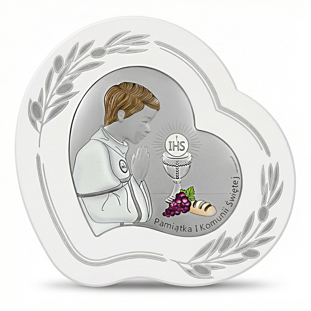 Srebrny obrazek komunijny w kształcie serca – kolorowa pamiątka I Komunii Świętej dla chłopca