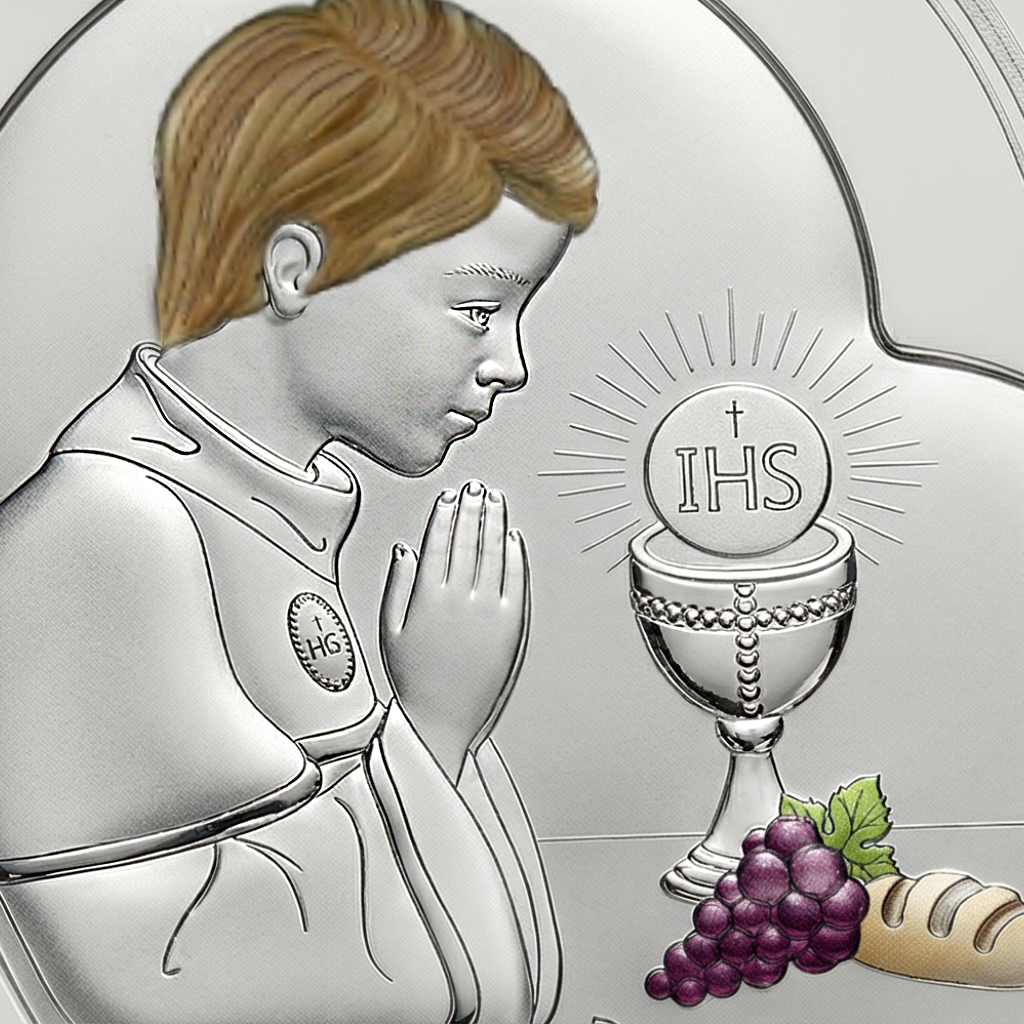Ten srebrny obrazek komunijny w kształcie serca przedstawia modlącego się chłopca przy kielichu z symbolem IHS oraz napisem „Pamiątka I Komunii Świętej”. Subtelne kolorowe detale (m.in. winogrona i akcenty na postaci) ocieplają kompozycję i sprawiają, że prezent wygląda jeszcze bardziej odświętnie – idealnie na Pierwszą Komunię Świętą.