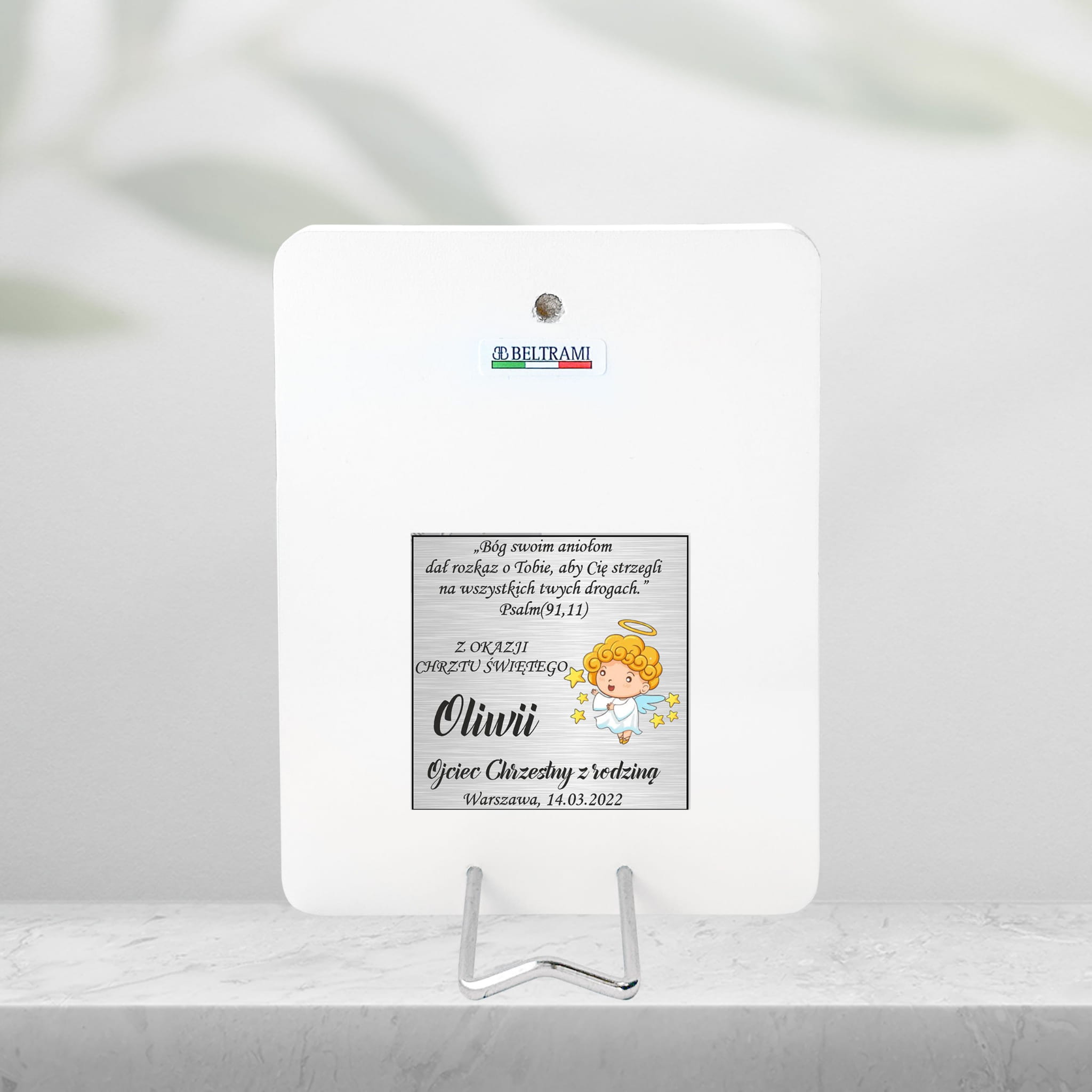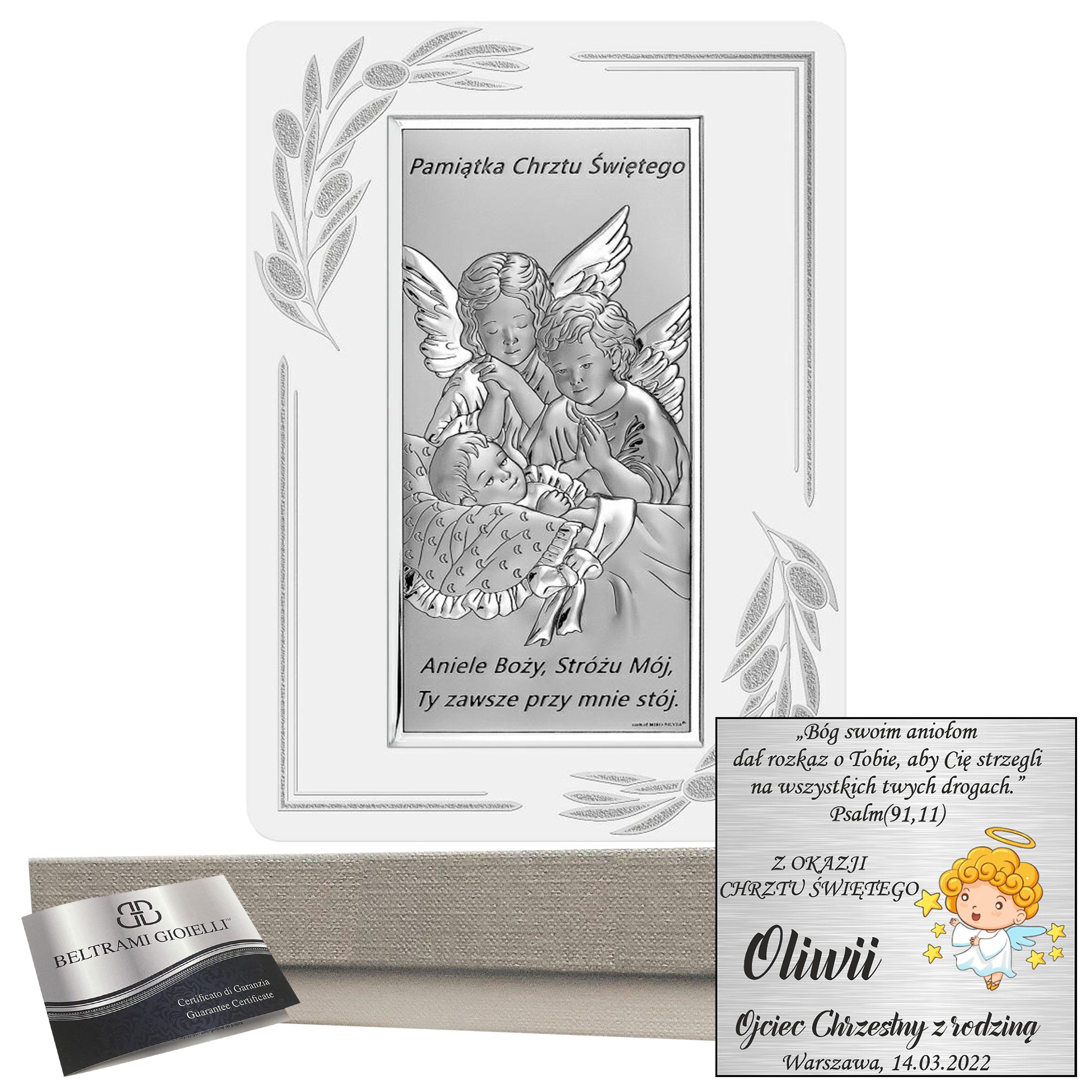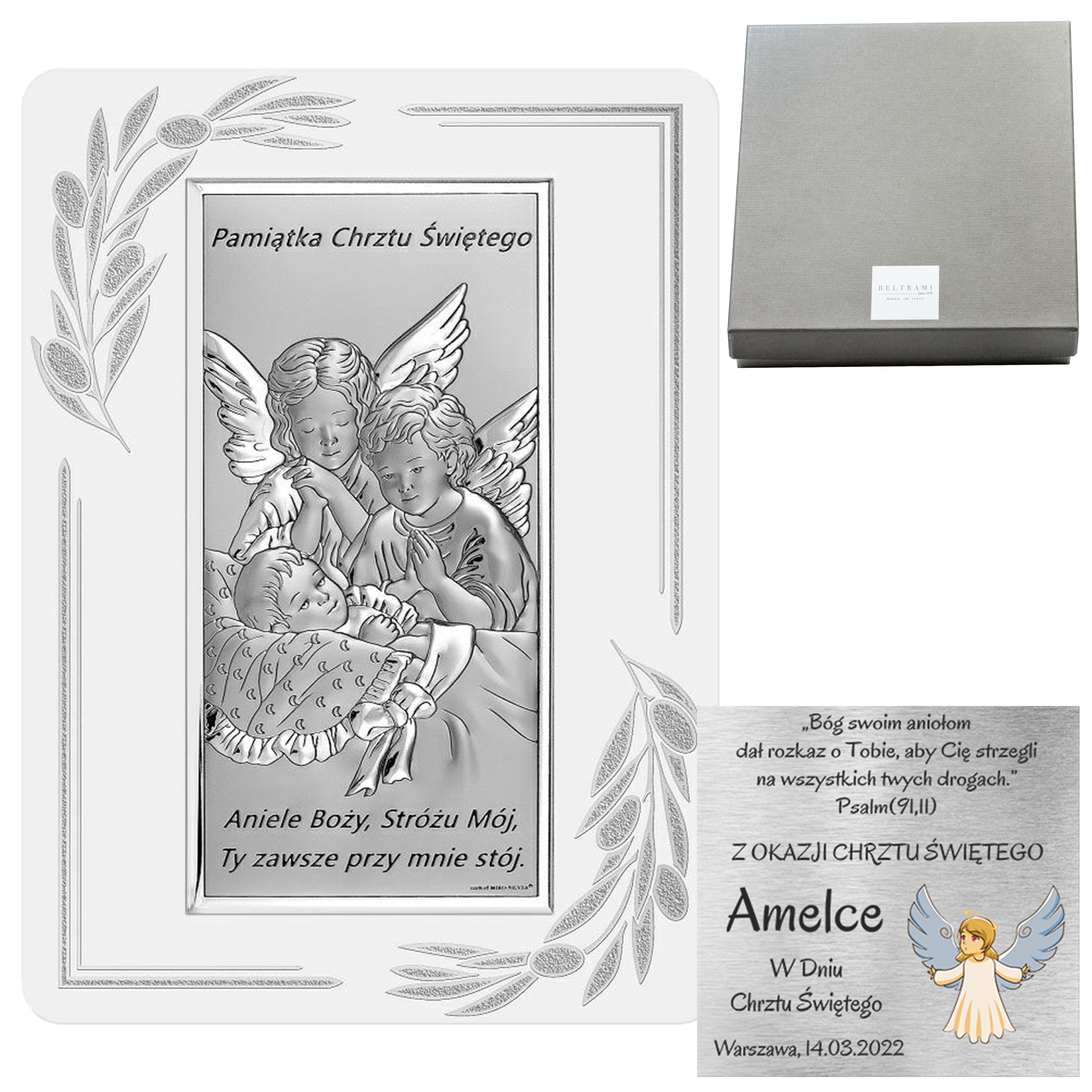 Srebrny obrazek na chrzest z aniołkiem – Pamiątka Chrztu Świętego z życzeniami