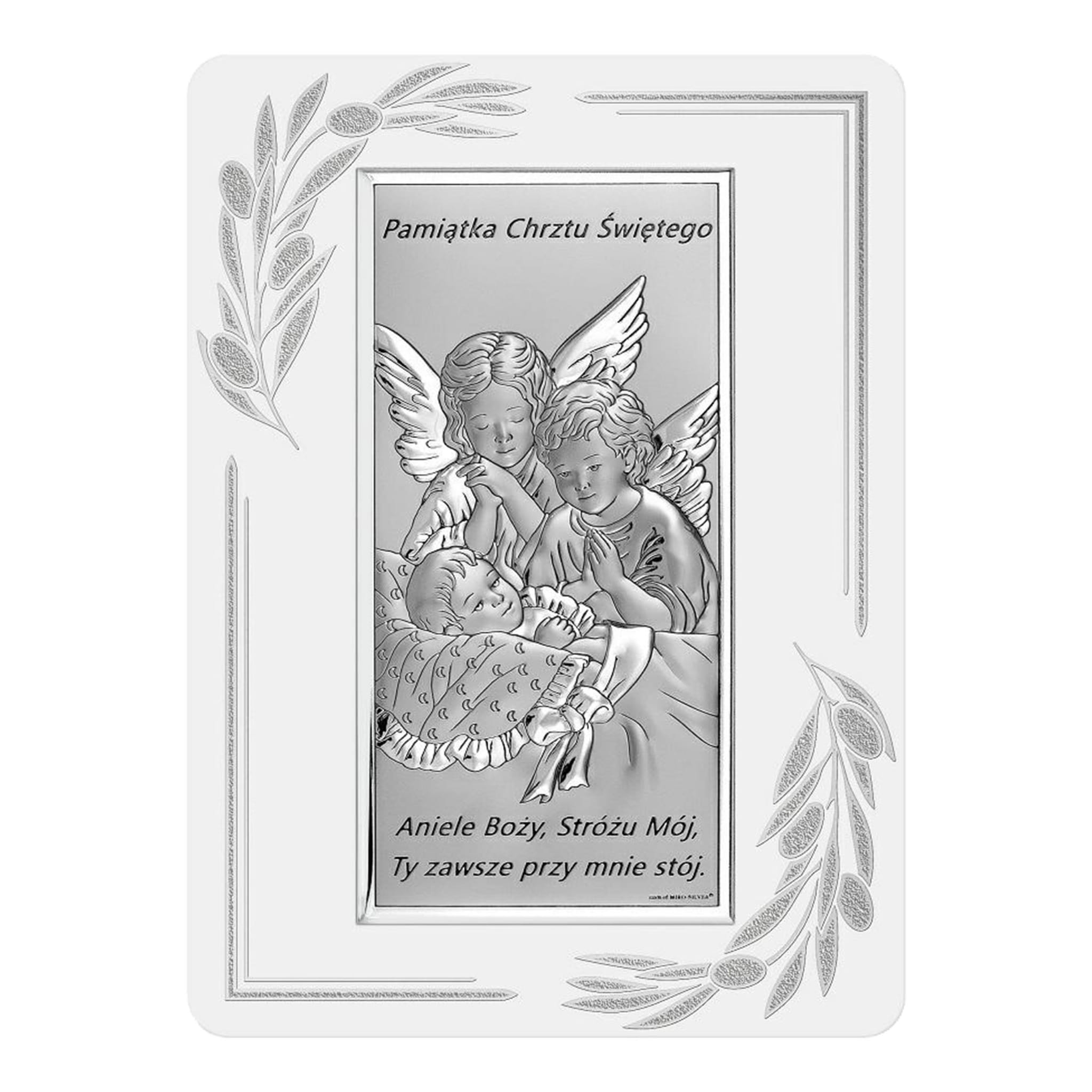Srebrny obrazek na chrzest z modlitwą Anioła Stróża + personalizacja