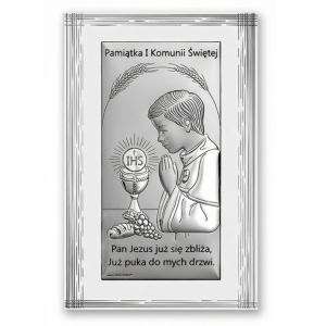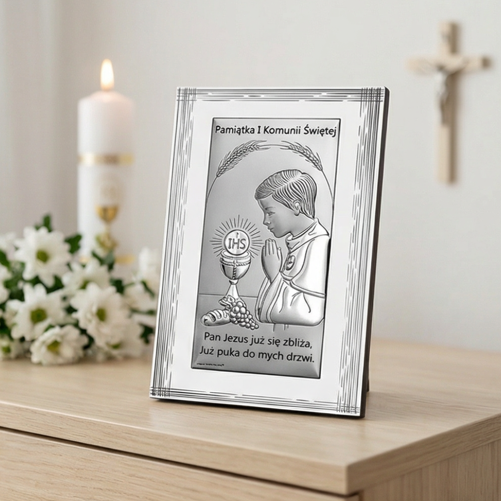 Srebrny obrazek na komunię z modlącym się chłopcem, symbolem IHS oraz kielichem to prezent o głębokim znaczeniu – idealny na I Komunię Świętą. Delikatna kompozycja nawiązuje do Eucharystii i pomaga zachować wspomnienie tego wyjątkowego dnia na długie lata.