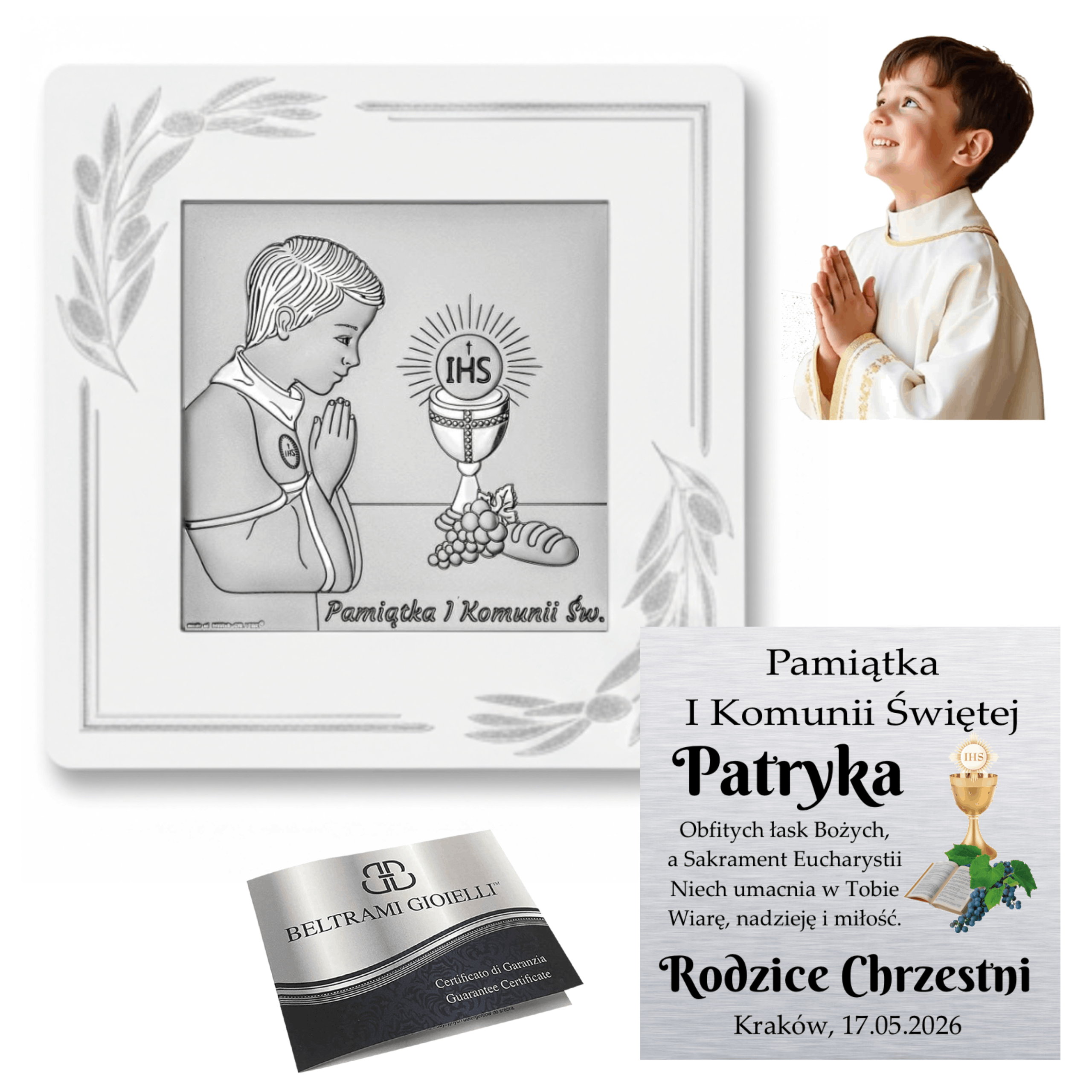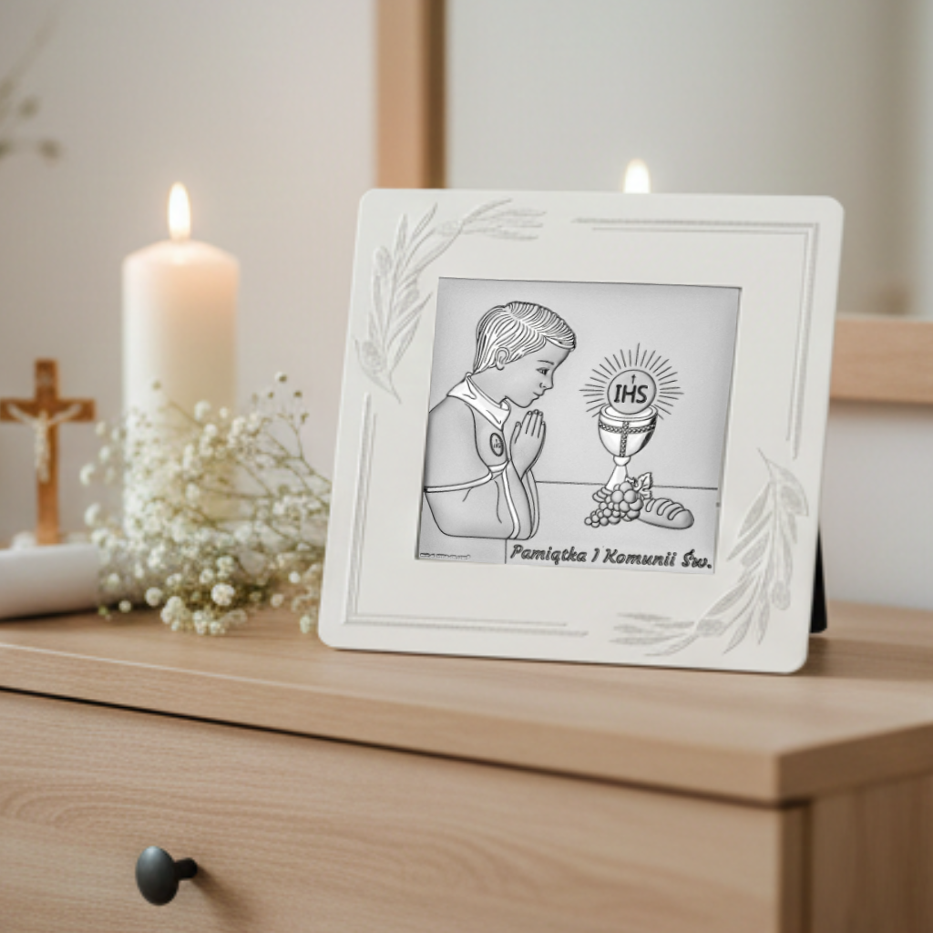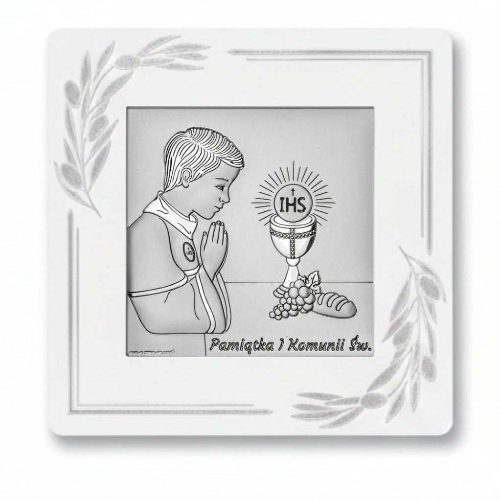 Srebrny obrazek na komunię – chłopiec i kielich IHS, ramka z liśćmi