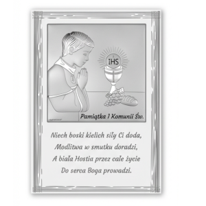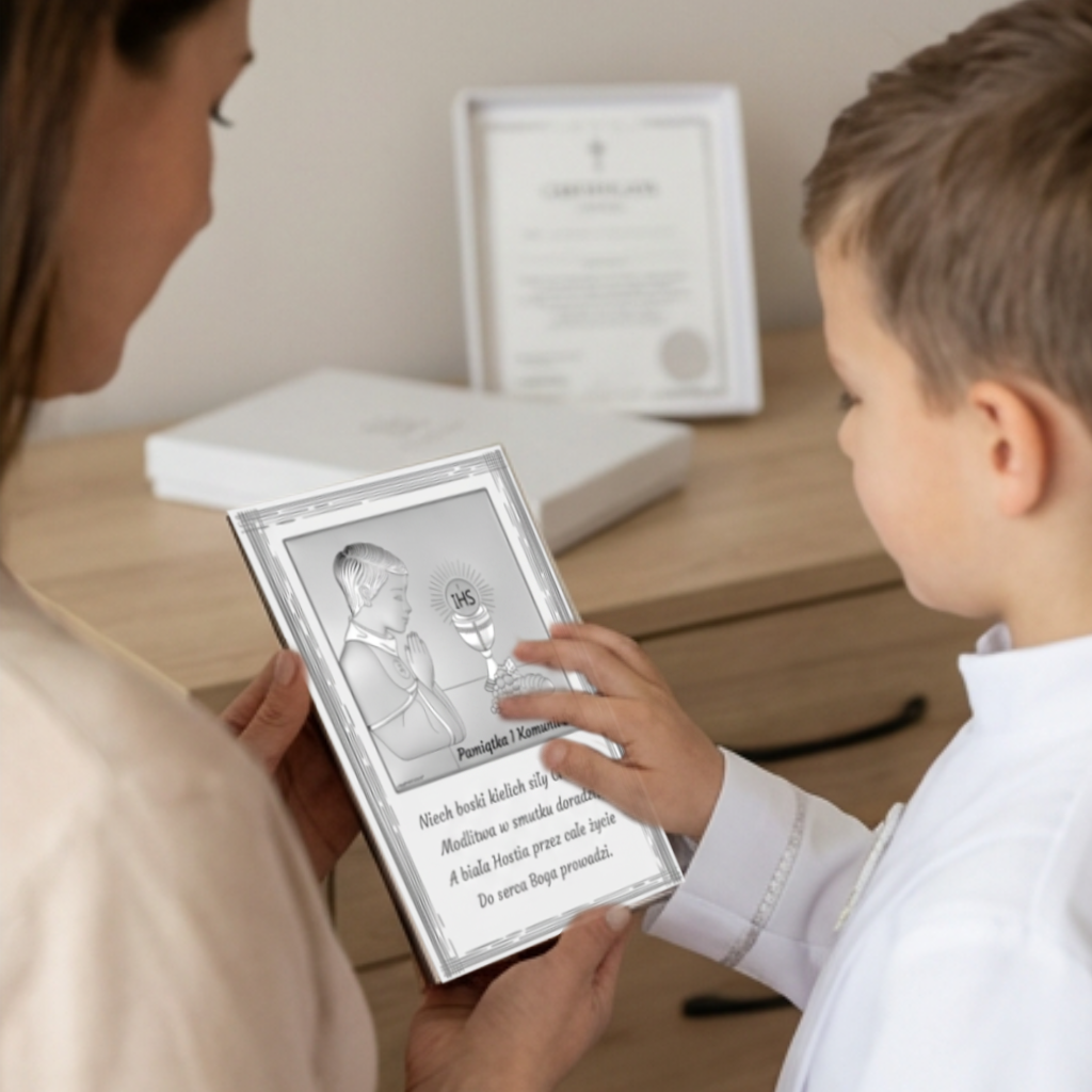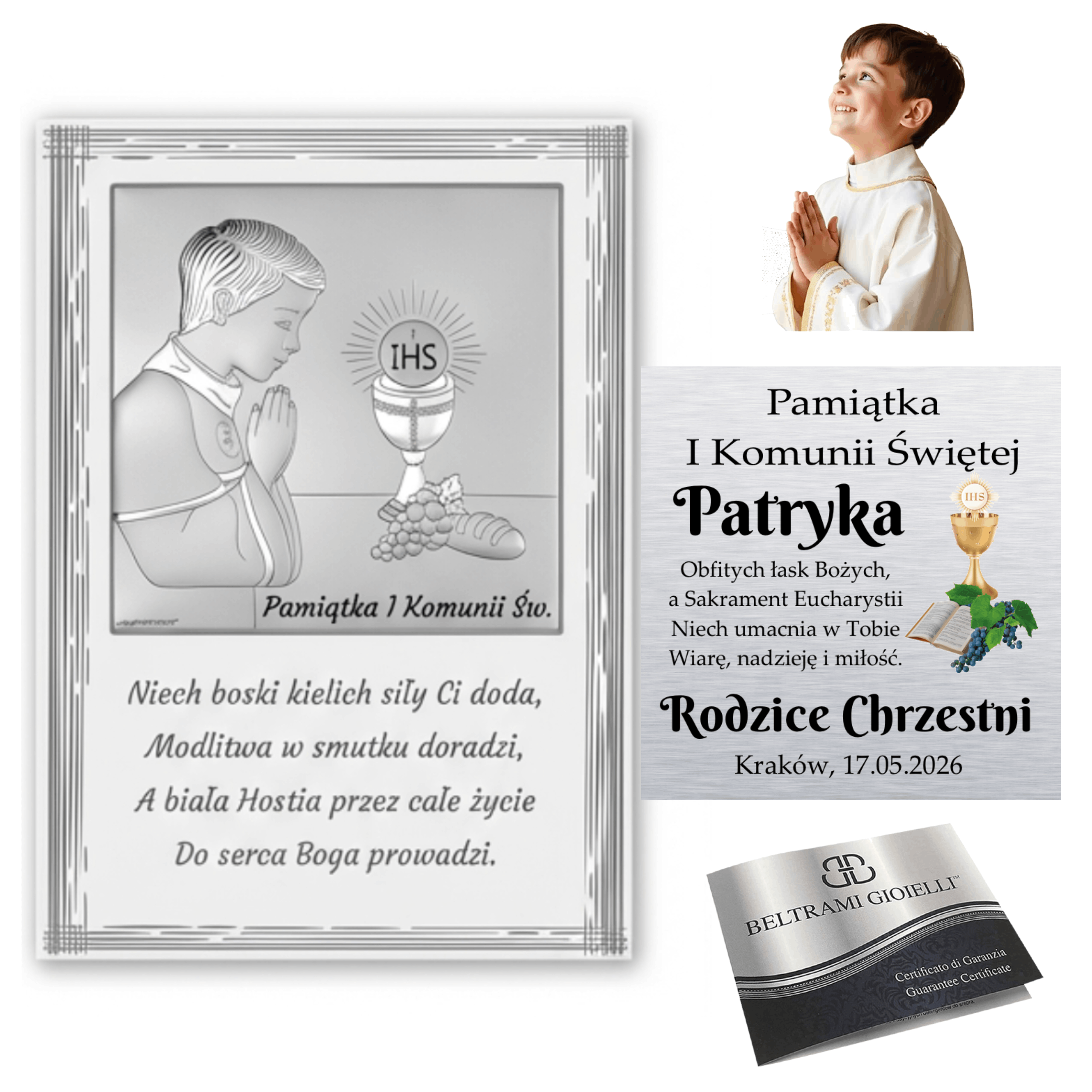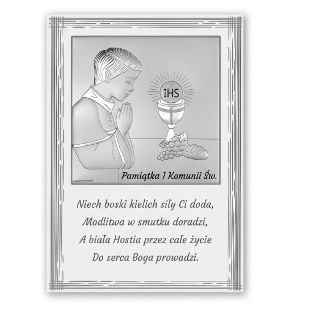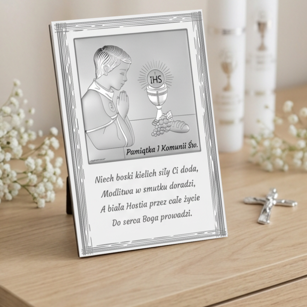 Srebrny obrazek na komunię – pamiątka z wierszykiem dla chłopca, która wzrusza