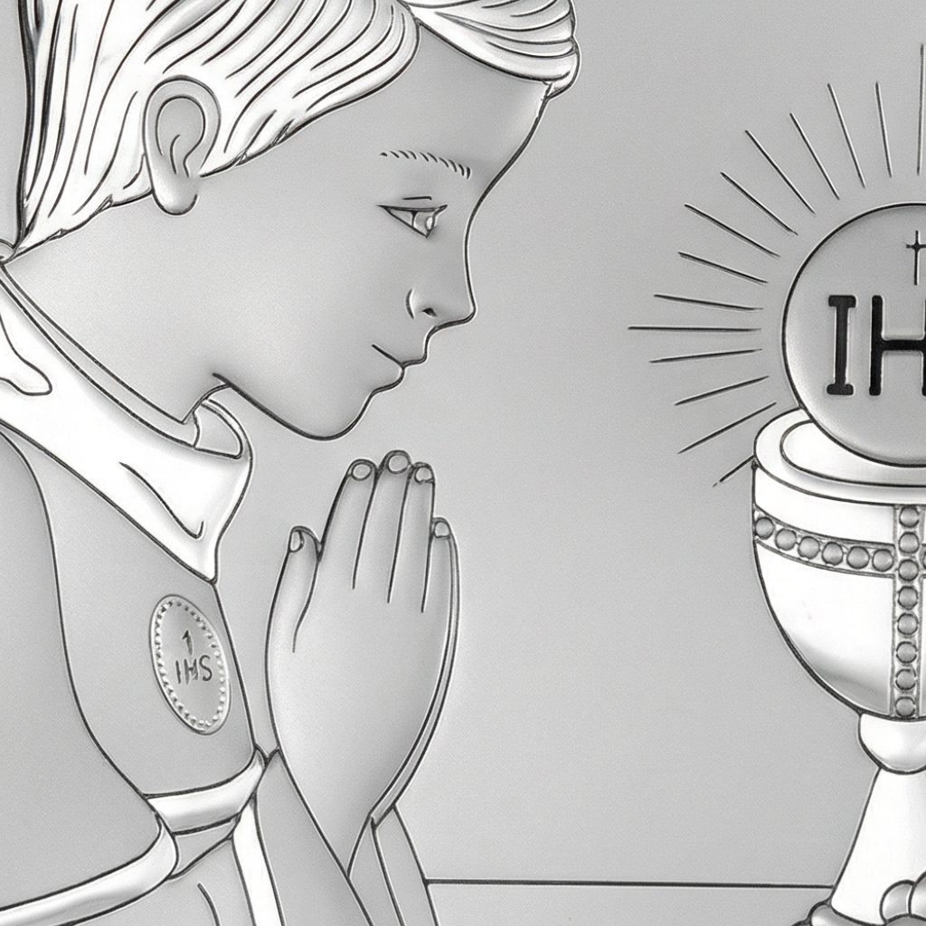Są prezenty, które zostają w sercu na dłużej niż jeden dzień. Ten srebrny obrazek na komunię przedstawia modlącego się chłopca oraz kielich z symbolem IHS, a dodatkowo zawiera wierszyk – gotowe, piękne słowa na pamiątkę I Komunii Świętej. Dzięki temu obrazek ma nie tylko elegancką formę, ale też przesłanie, do którego można wracać po latach.