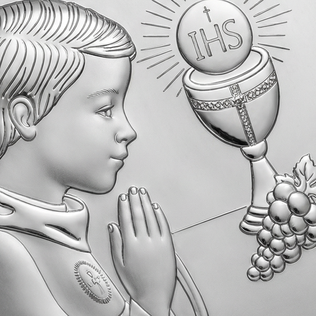 Jeśli szukasz prezentu, który ma głębię i podkreśla duchowy wymiar uroczystości, ten srebrny obrazek na komunię będzie wyjątkowym wyborem. Motyw modlącego się chłopca oraz kielicha z symbolem IHS tworzy elegancką pamiątkę I Komunii Świętej – idealną do pokoju dziecka lub rodzinnego kącika wspomnień.