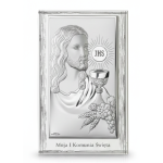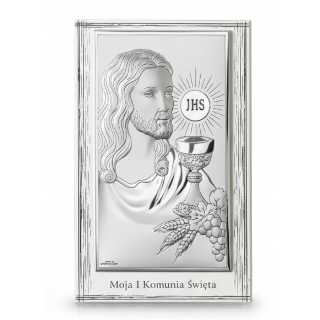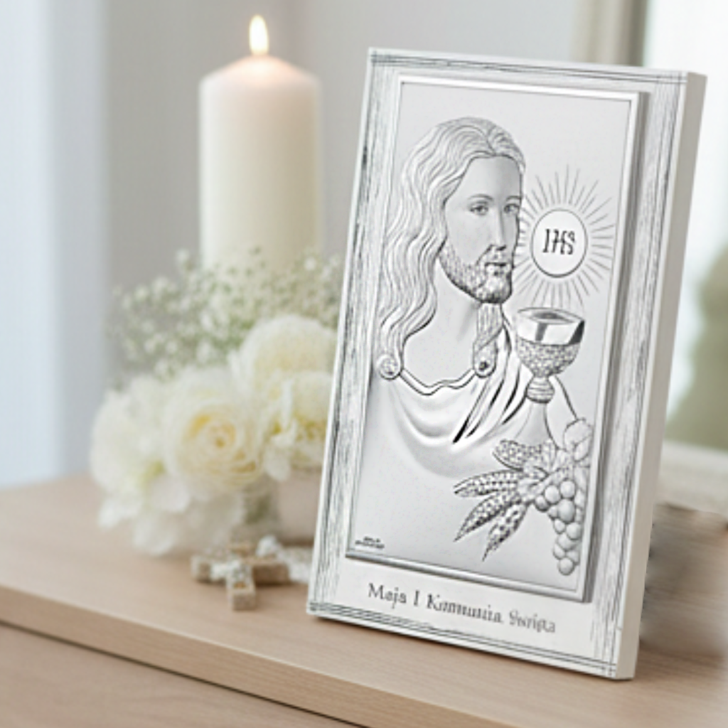 Szukasz prezentu, który ma w sobie i piękno, i znaczenie? Srebrny obrazek na komunię z wizerunkiem Jezusa, symbolem IHS oraz kielichem to wyjątkowa pamiątka sacrum – idealna na I Komunię Świętą. Subtelna kompozycja i eleganckie wykończenie sprawiają, że obrazek pięknie wygląda w pokoju dziecka i przypomina o ważnym dniu przez długie lata.