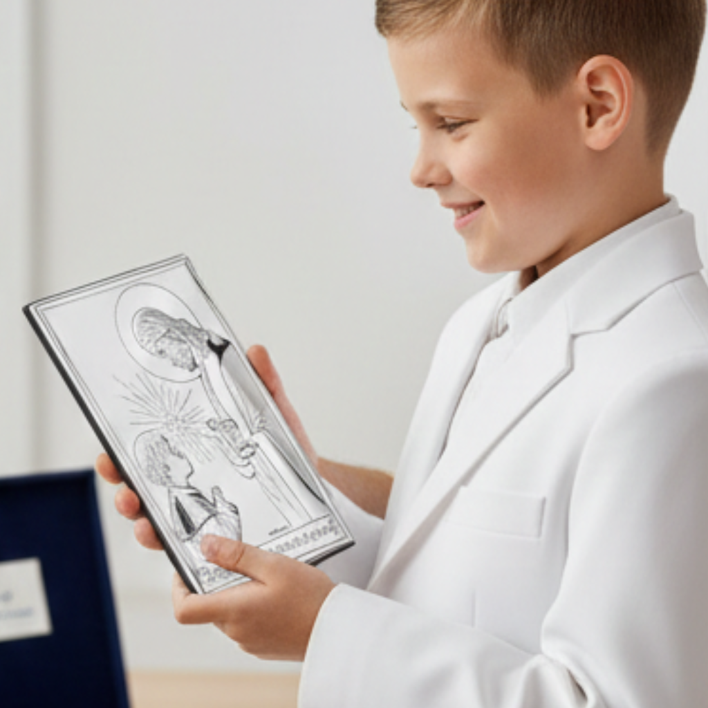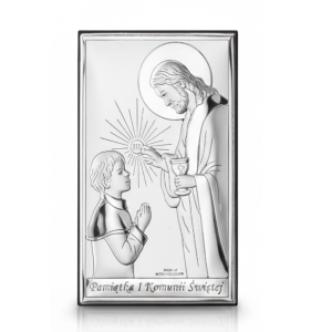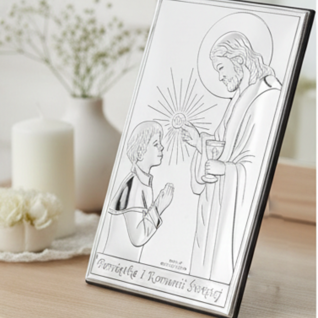 Srebrny obrazek na komunię z motywem Jezusa udzielającego Komunii to wyjątkowa pamiątka dla dziecka – szczególnie piękna jako prezent dla chłopca. Subtelna symbolika, elegancki połysk i napis „Pamiątka I Komunii Świętej” sprawiają, że to upominek, do którego wraca się po latach.