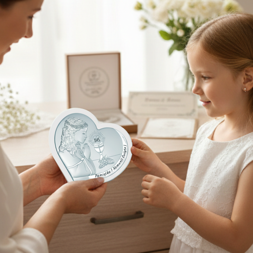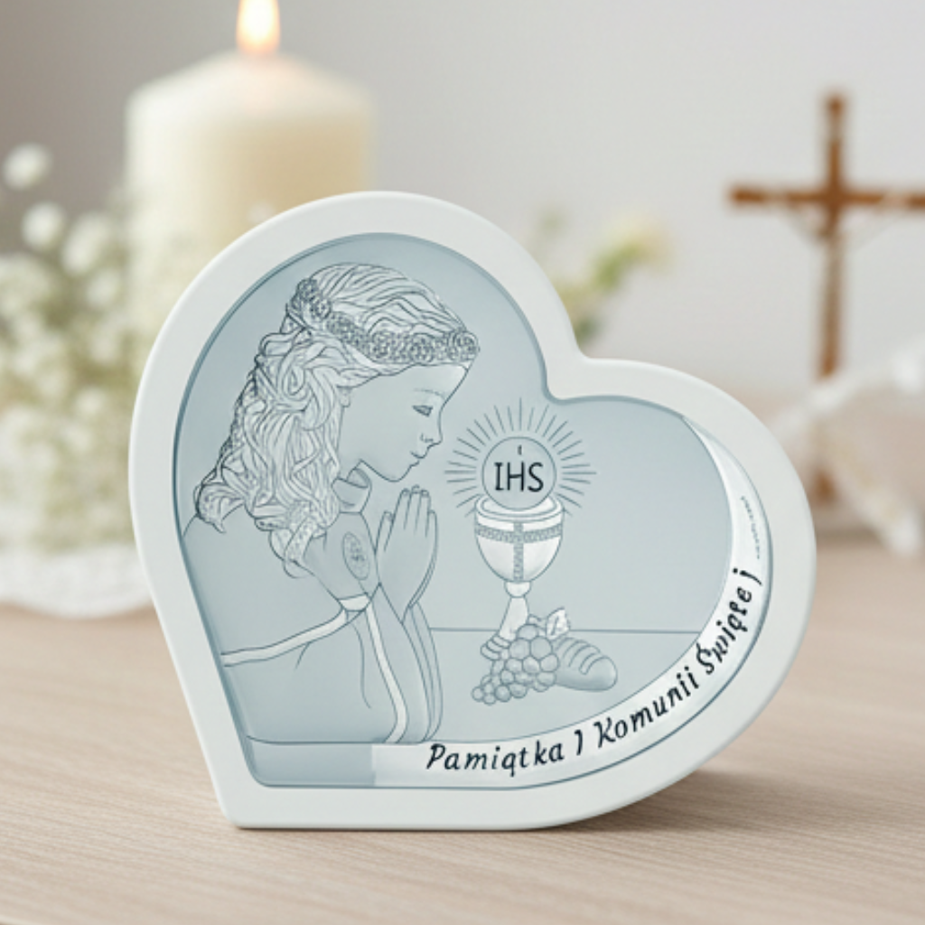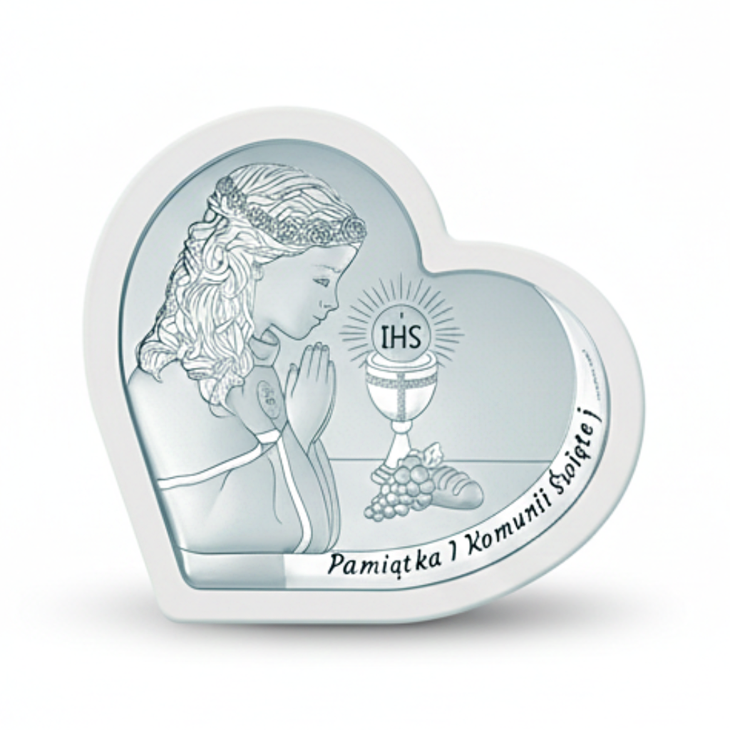Srebrny obrazek na komunię – serce w jasnej ramce, pamiątka pełna ciepła