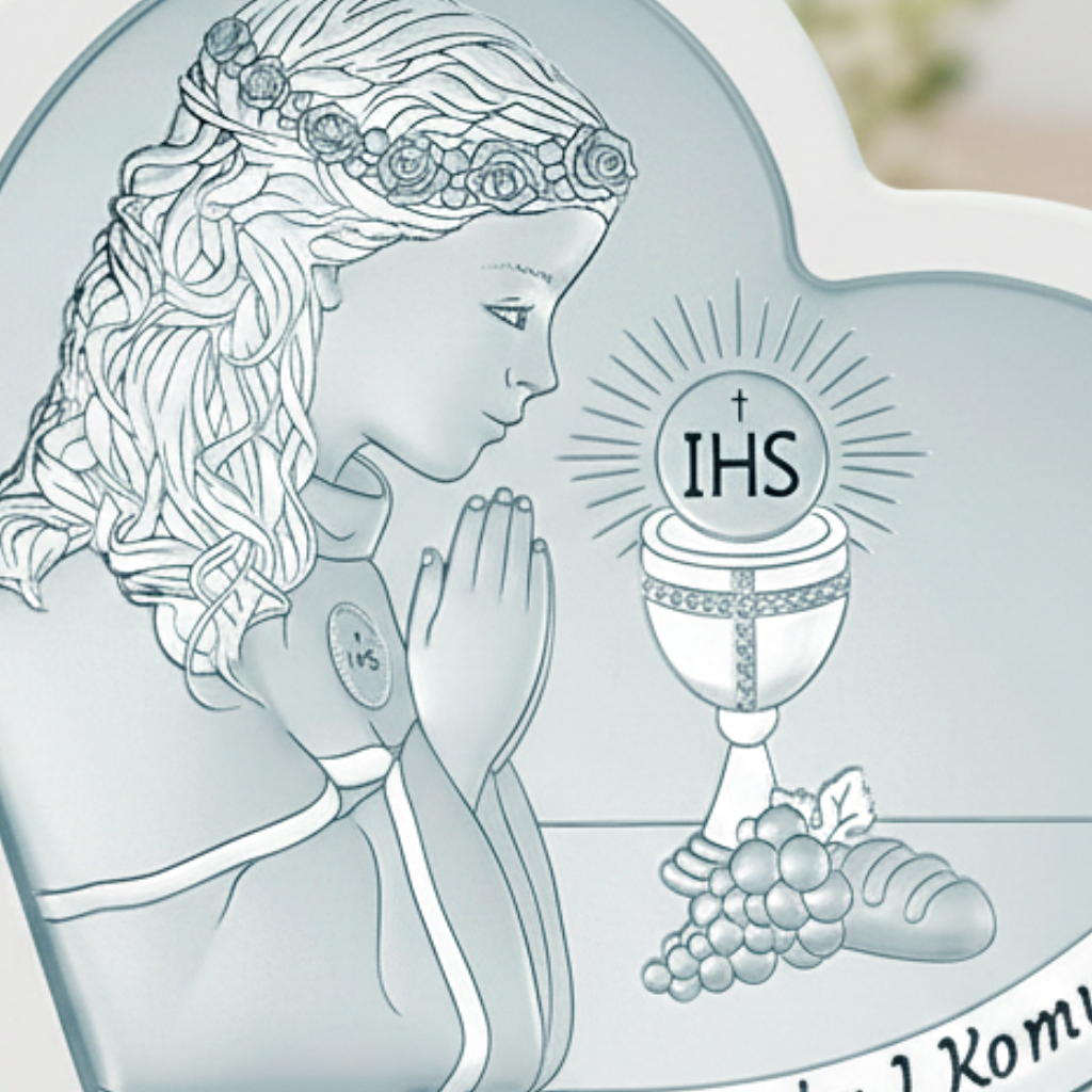 Jeśli chcesz podarować prezent, który ma duchowe znaczenie i jednocześnie wygląda wyjątkowo delikatnie, ten srebrny obrazek na komunię będzie idealny. Motyw modlącej się dziewczynki oraz kielicha z symbolem IHS podkreśla sacrum uroczystości, a forma serca oraz jasna (kremowa) ramka dodają całości ciepła i emocji – dokładnie takich, jakie towarzyszą I Komunii Świętej.