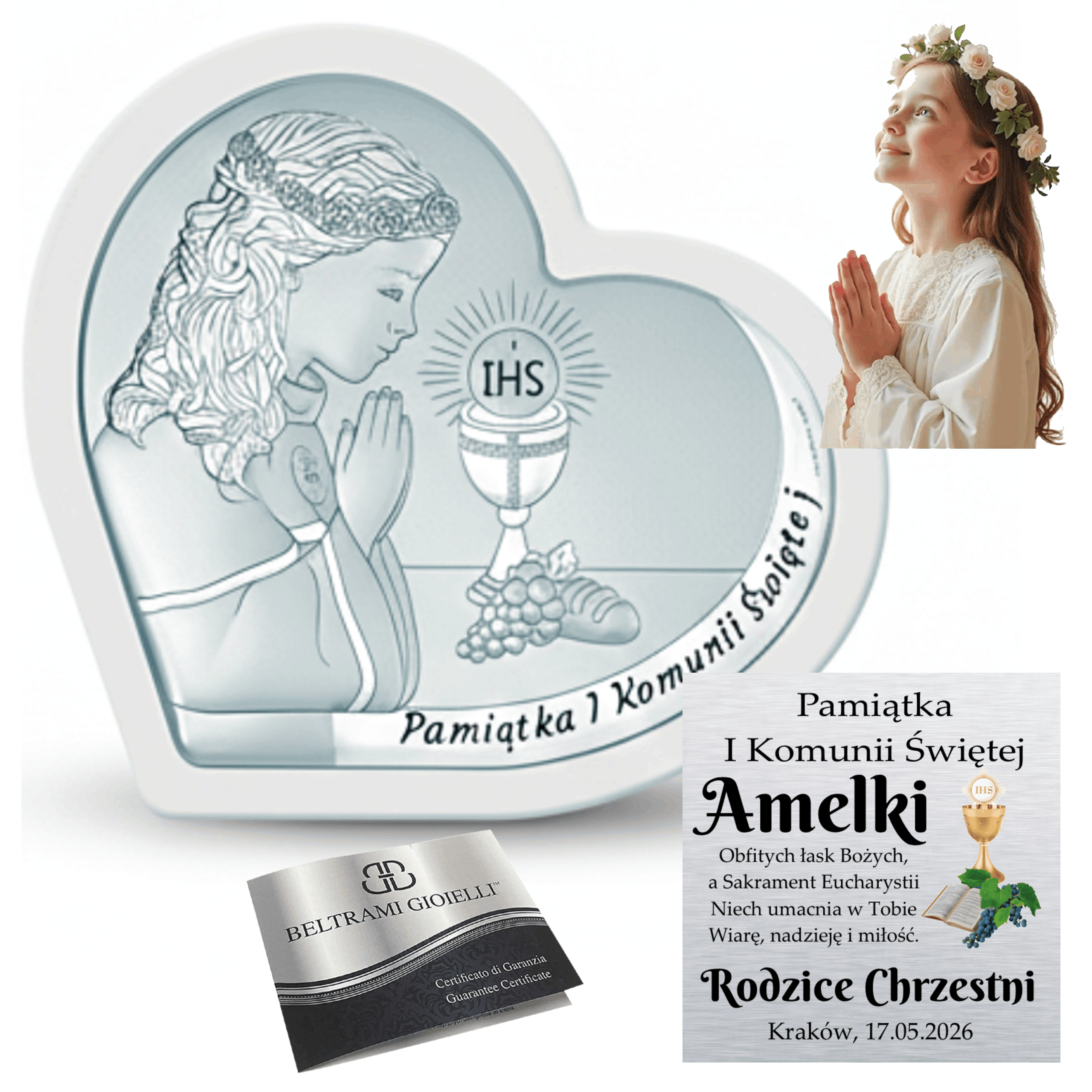 Srebrny obrazek na komunię – serce, dziewczynka i kielich IHS, jasna ramka