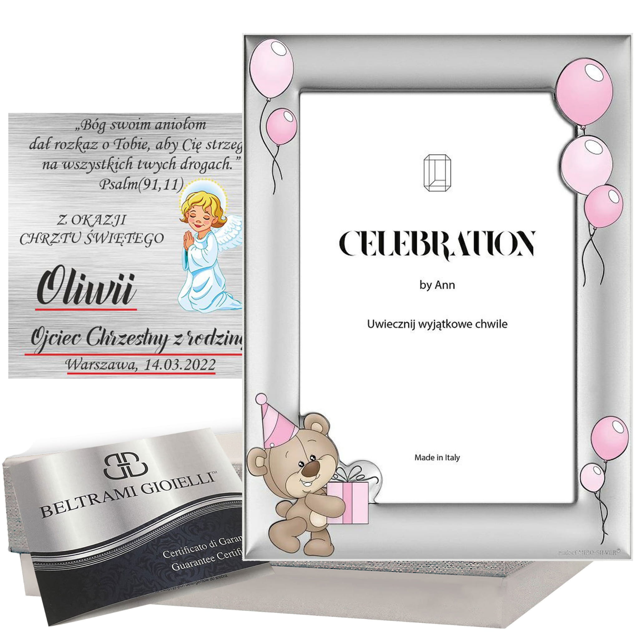 Srebrna ramka na zdjęcie 18,5x14 miś i baloniki różowe + pamiątka