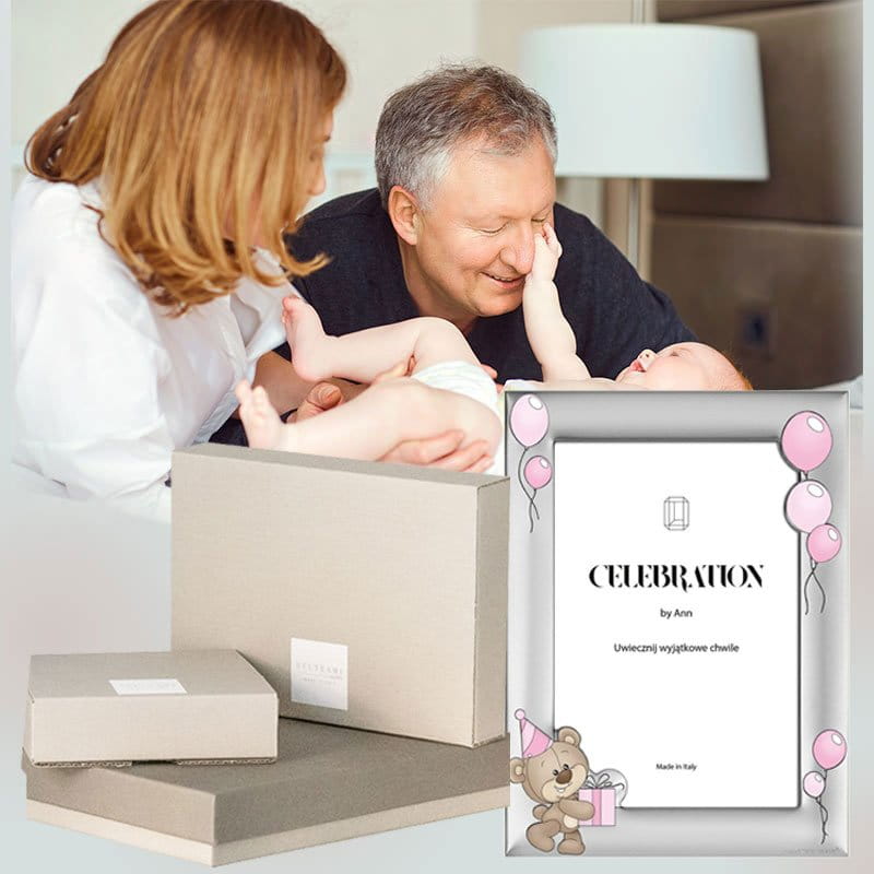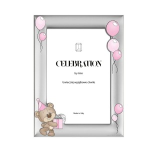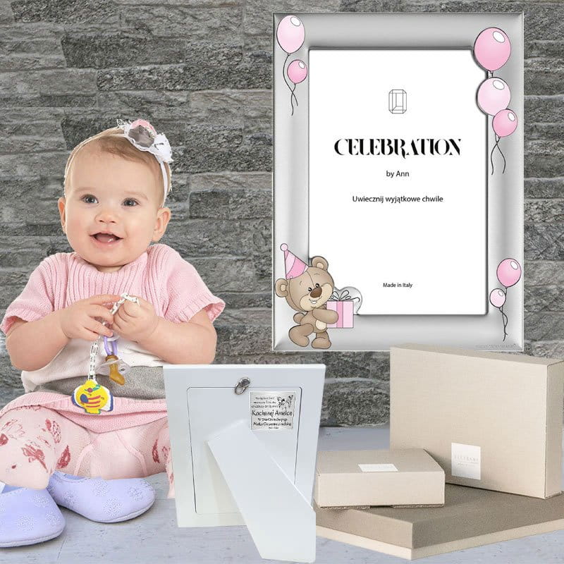 Szukasz prezentu, który będzie praktyczny, ładny i zostanie z rodziną na lata? Ta srebrna ramka na zdjęcie z kolekcji CELEBRATION by Ann w różowej wersji zdobień (miś z prezentem i różowe baloniki) to prosty sposób, żeby oprawić najważniejszą fotografię z chrztu, narodzin lub roczku. Wkładasz zdjęcie i gotowe — wspomnienie z ważnego dnia od razu staje się częścią domowej dekoracji.