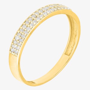 Złoty pierścionek o delikatnym wzorze z osadzonymi białymi i błyszczącymi cyrkoniami.