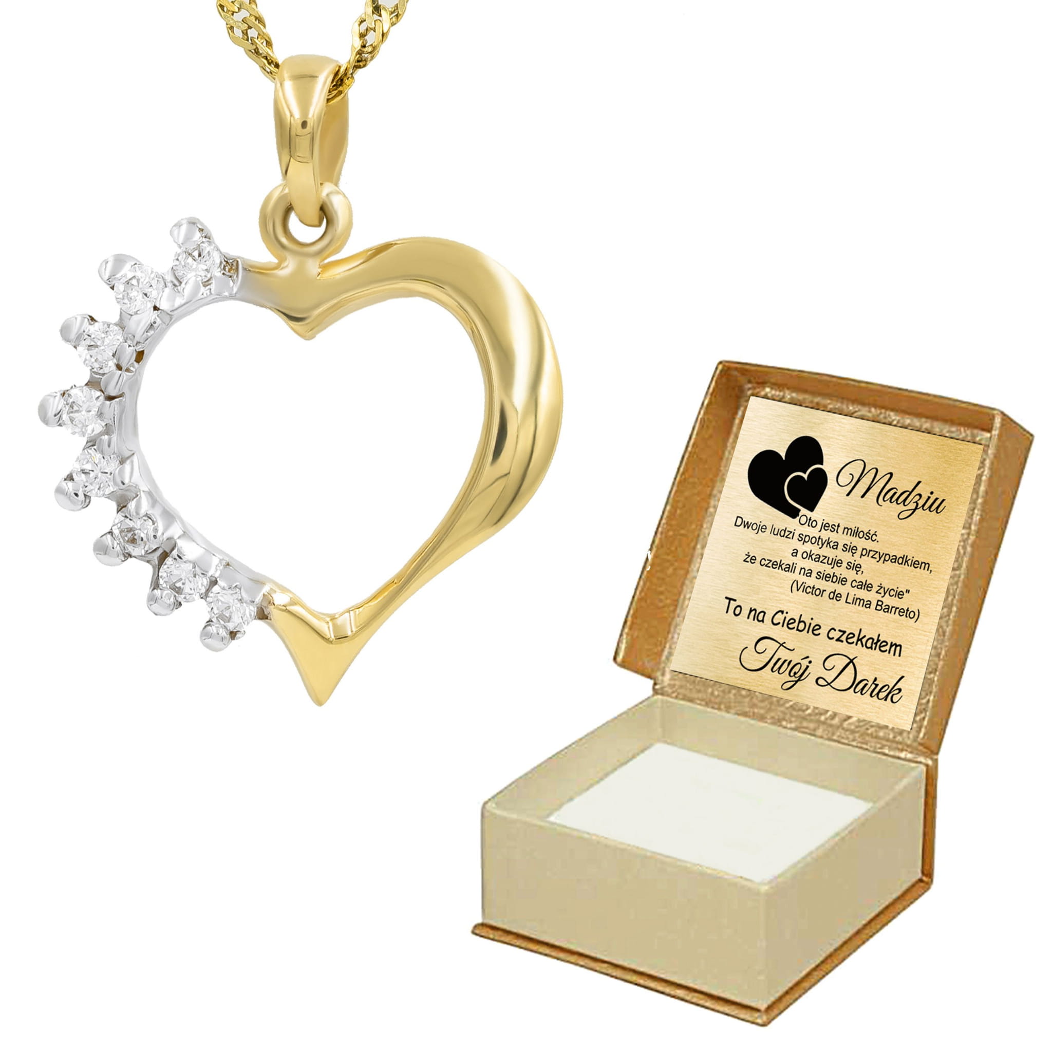 Złota zawieszka w kształcie serca z delikatnym zdobieniem i osadzonymi cyrkoniami. Cudowny prezent, który możemy wręczyć kobiecie z okazji imienin, urodzin czy rocznicy. Wręczony upominek na pewno spowoduje uśmiech na twarzy. Każdy wzór posiada metkę jubilerską. Opakowanie GRATIS.