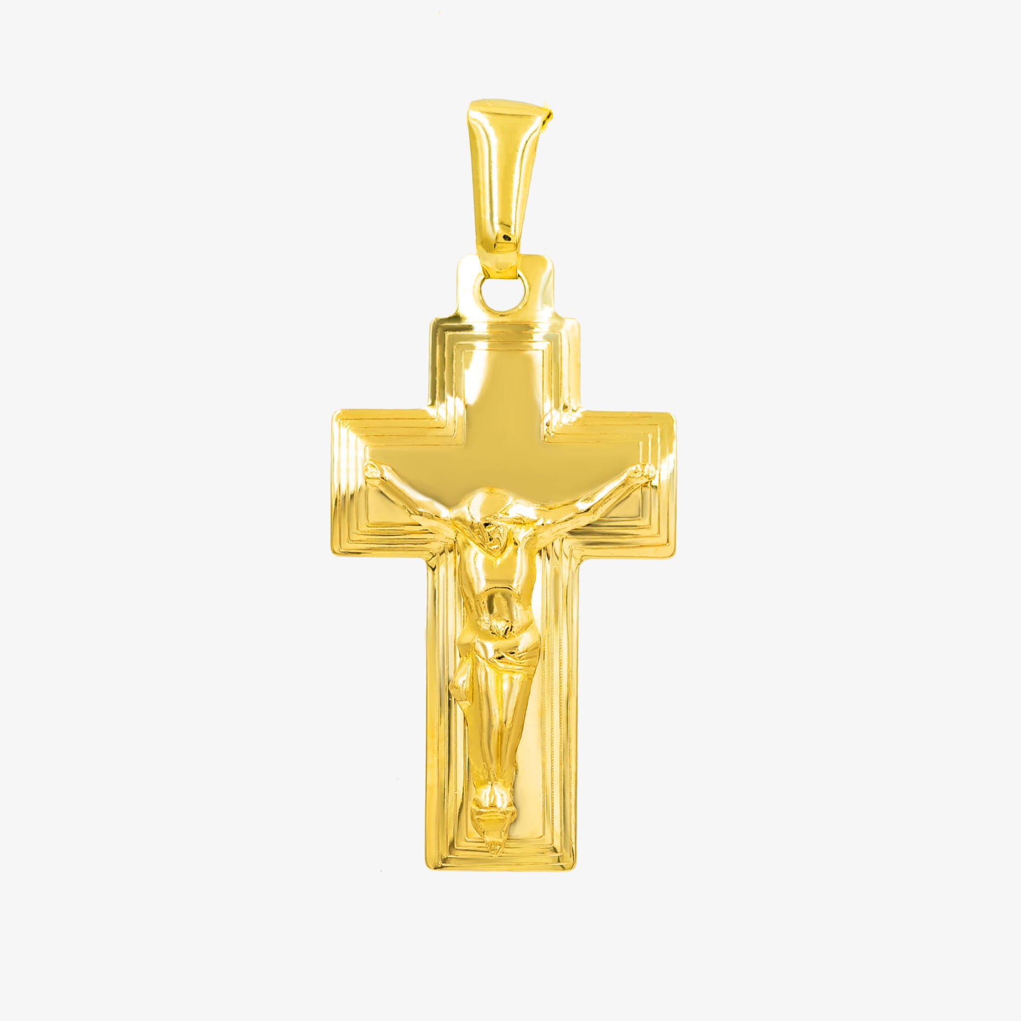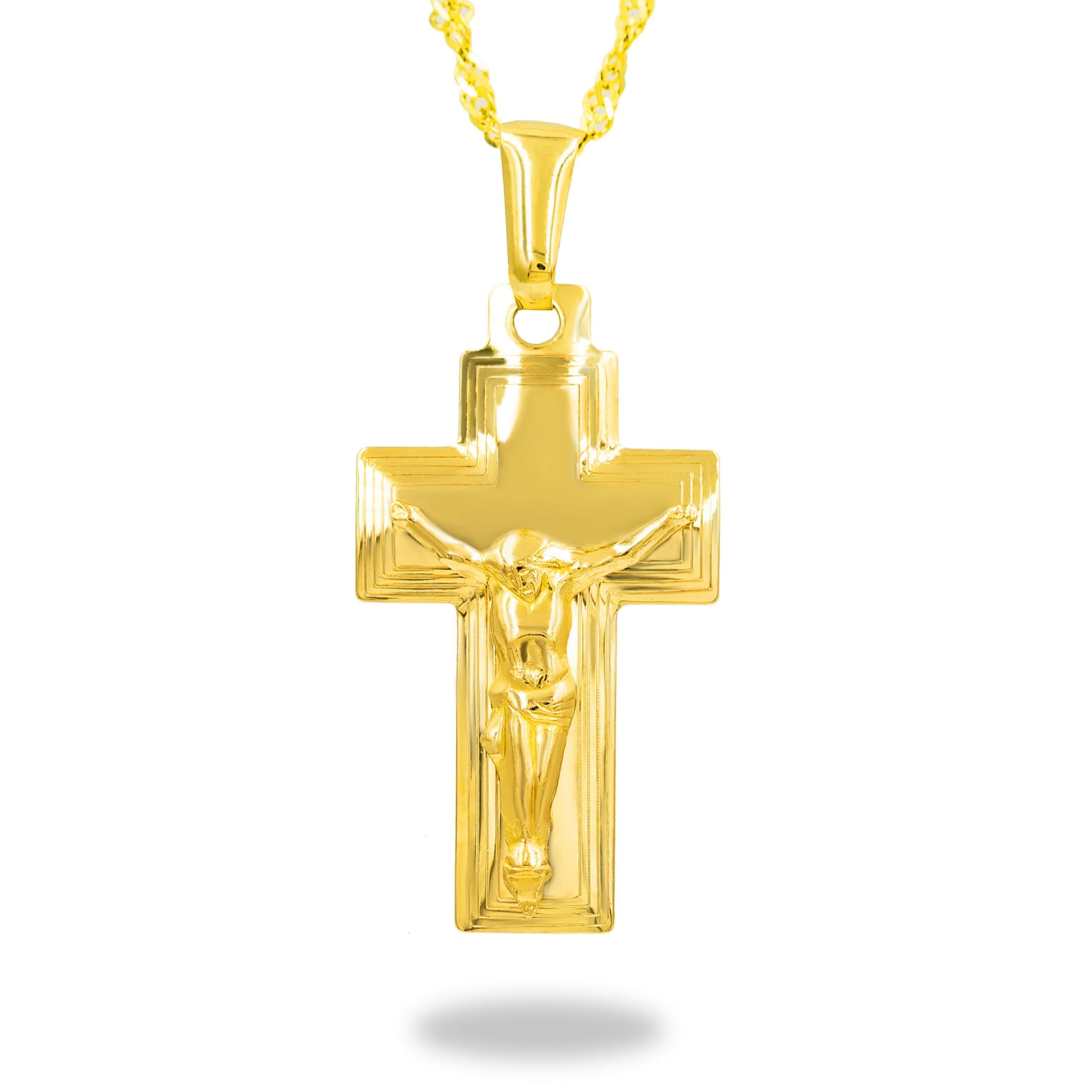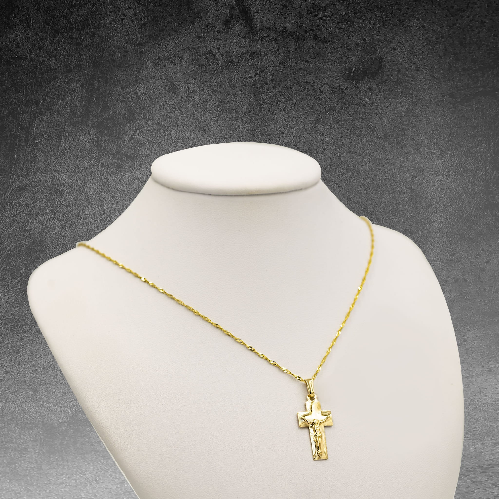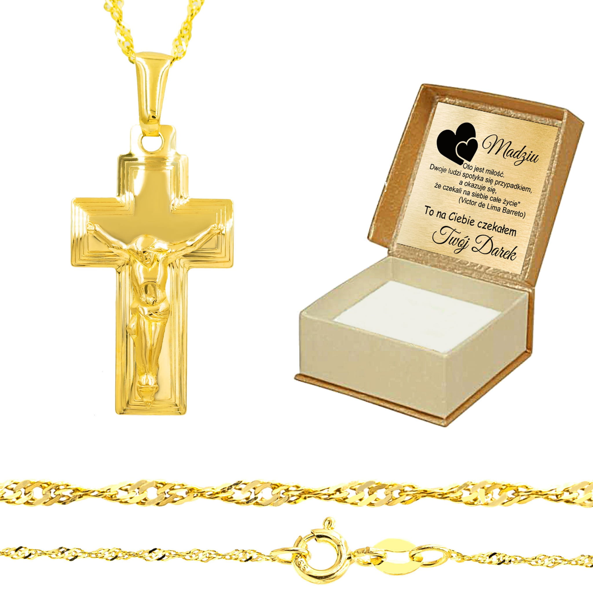Zawieszka złotego krzyża o delikatnym zdobieniu i osadzonym na nim Panem Jezusem Chrystusem. Podarowany dziecku w dniu Pierwszej Komunii Świętej przez rodziców chrzestnych lub dziadków na pewno spowoduje radość na twarzy . Każdy wzór posiada metkę jubilerską. Opakowanie GRATIS.