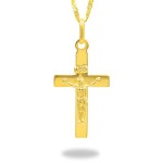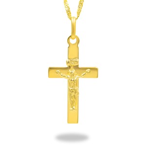 Zawieszka złotego krzyża z osadzonym Panem Jezusem Chrystusem. Podarowany dziecku w dniu Pierwszej Komunii Świętej przez rodziców chrzestnych lub dziadków na pewno spowoduje radość na twarzy . Każdy wzór posiada metkę jubilerską. Opakowanie GRATIS.