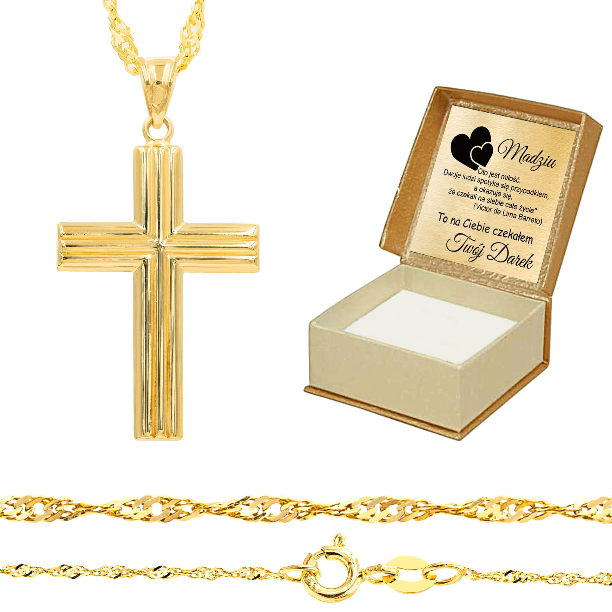 Krzyżyk zawieszka wykonany ze złota. Sprawi się znakomicie jako prezent na Komunię Świętą od rodziców, chrzestnych oraz dziadków.