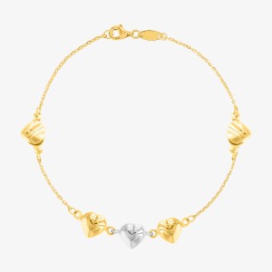 Romantyczne serduszka wykonane z żółtego i białego złota podkreślają elegancję i dodają bransoletce wyrazistości.