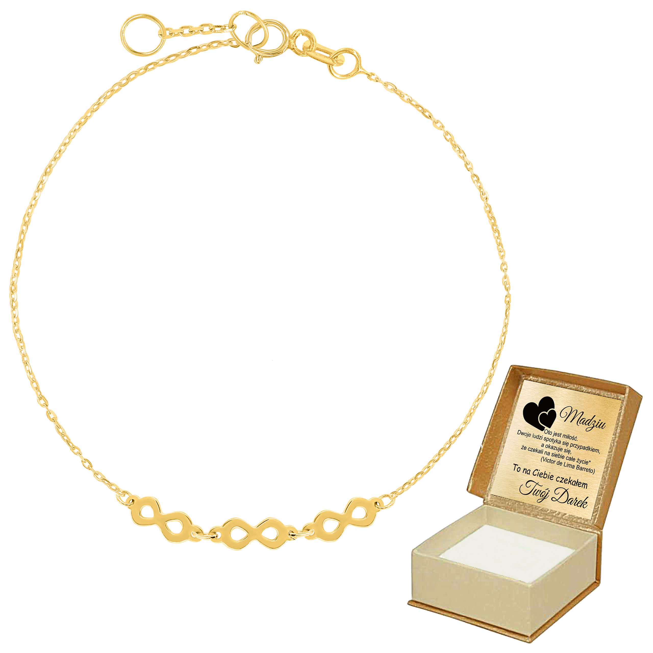 Złota bransoletka z motywem nieskończoności to doskonały wybór dla osób ceniących symbolikę i prostotę w eleganckiej formie. To biżuteria, która podkreśli Twój styl i doda wyjątkowego znaczenia każdej chwili.