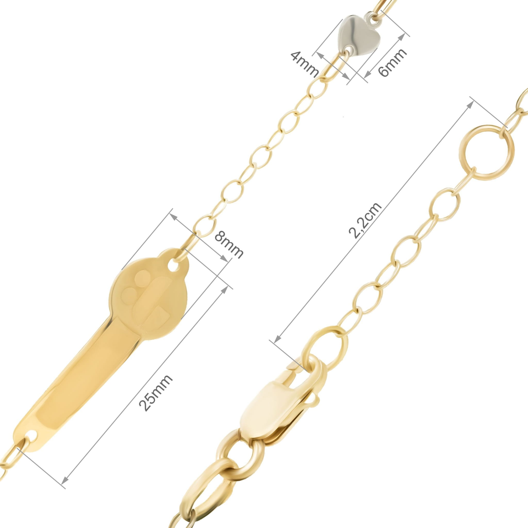 Bransoletka ozdobiona jest subtelnym sercem wykonanym z białego złota oraz uroczym wózeczkiem z żółtego złota. Połączenie dwóch kolorów złota dodaje jej nowoczesnego i stylowego wyglądu.