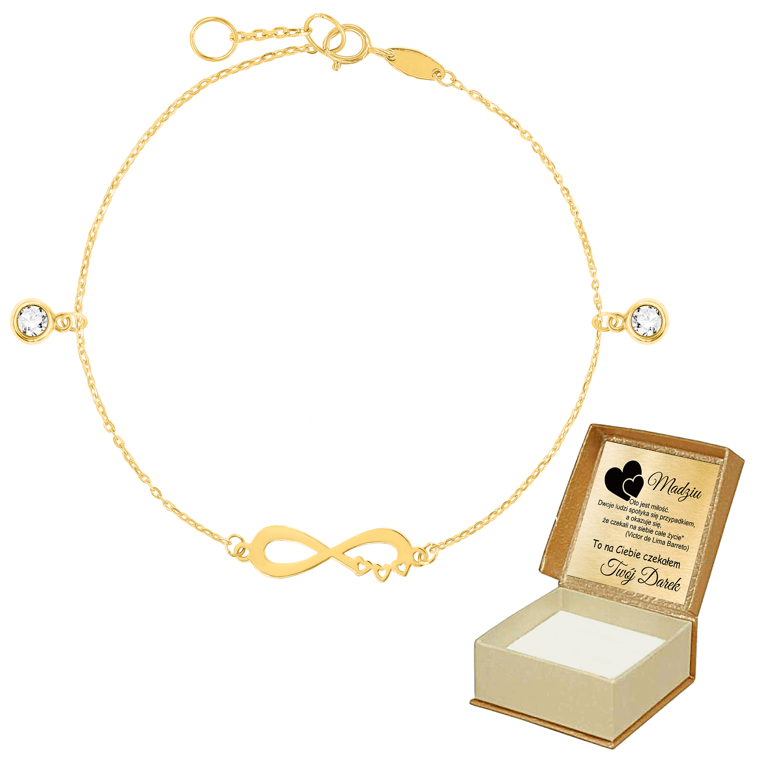 Złota bransoletka z zawieszkami kuleczek z osadzonymi cyrkoniami oraz ze znakiem nieskończoności z umieszczonymi na niej serduszkami.