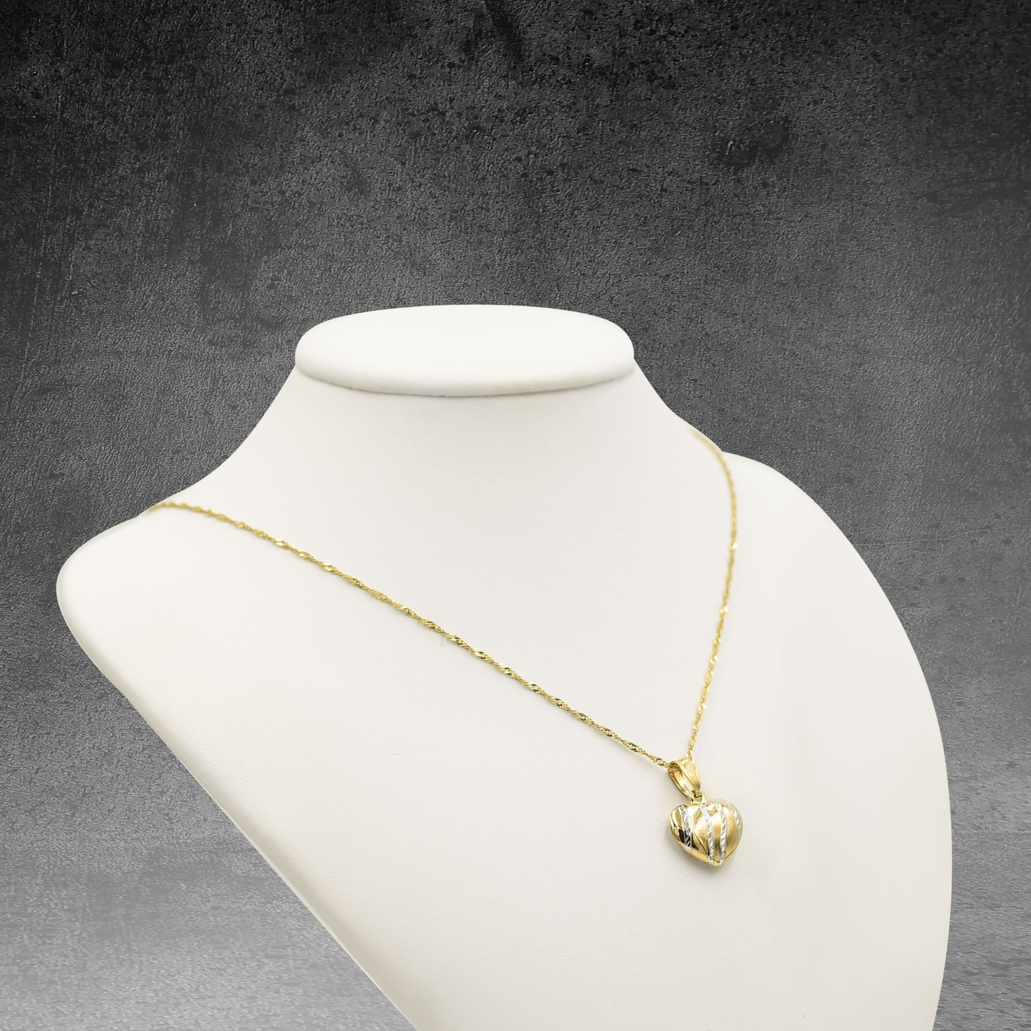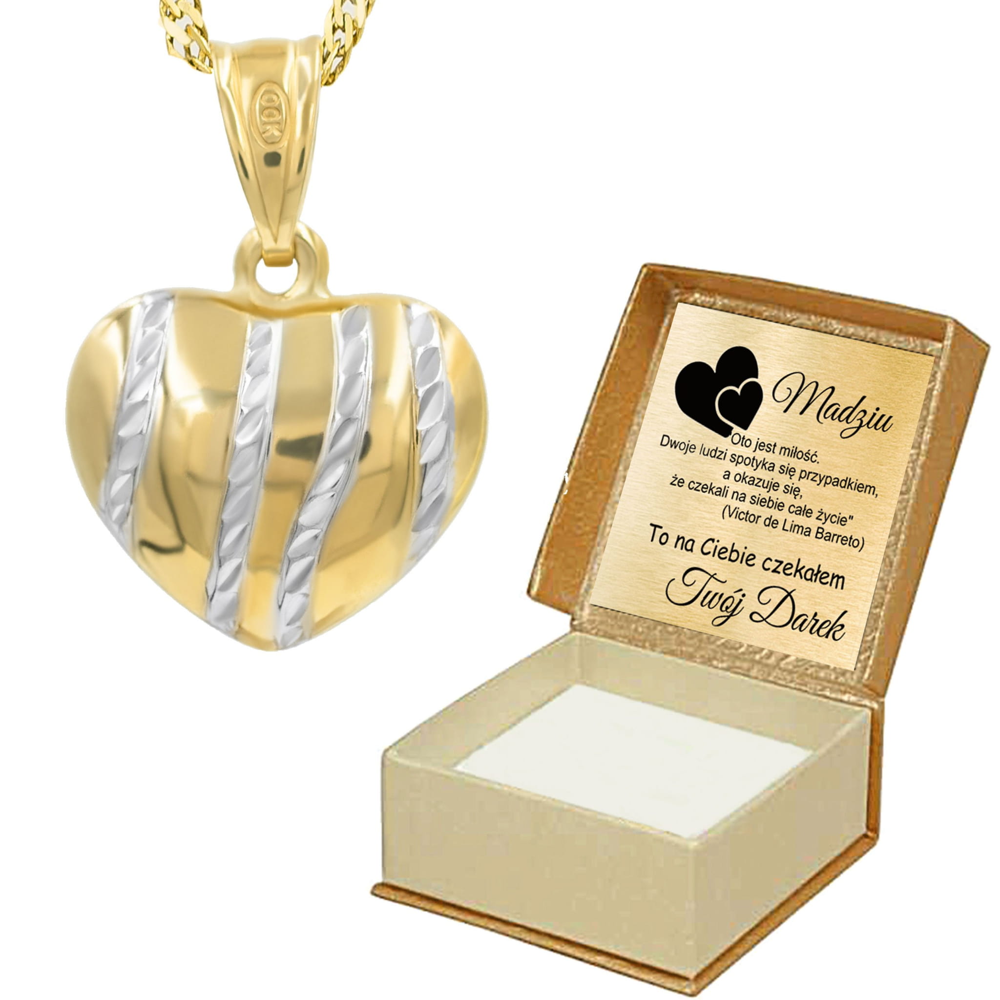 Złota zawieszka w kształcie serca z niestandardowym zdobieniem. Cudowny prezent, który możemy wręczyć kobiecie z okazji imienin, urodzin czy rocznicy. Wręczony upominek na pewno spowoduje uśmiech na twarzy. Każdy wzór posiada metkę jubilerską. Opakowanie GRATIS.